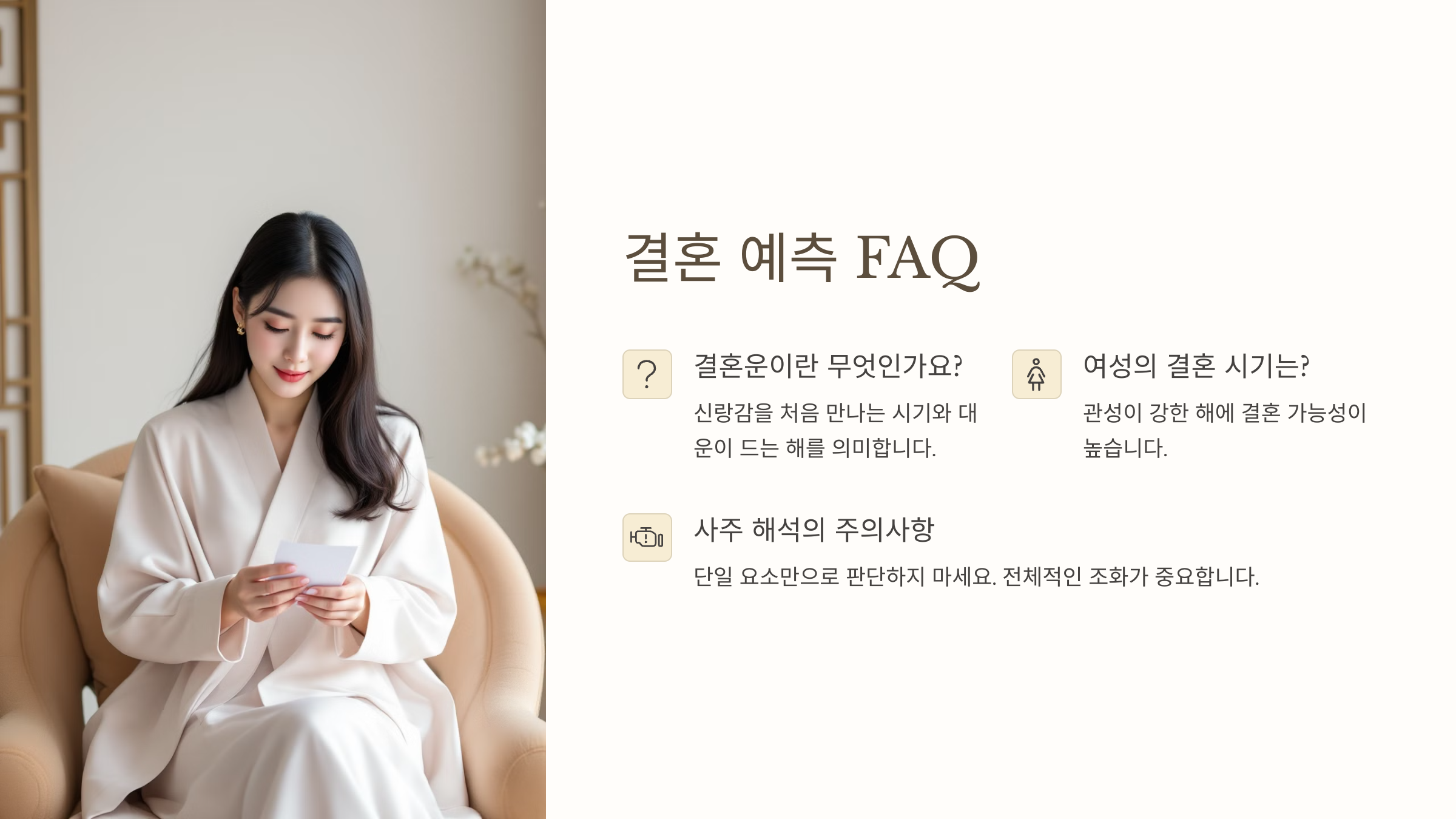 A1. 보통 20대 후반부터 40대 초반까지 재성이나 결혼운의 흐름을 중점적으로 봐요. 대운과 세운을 함께 고려하면 정확한 타이밍을 더 잘 알 수 있어요.