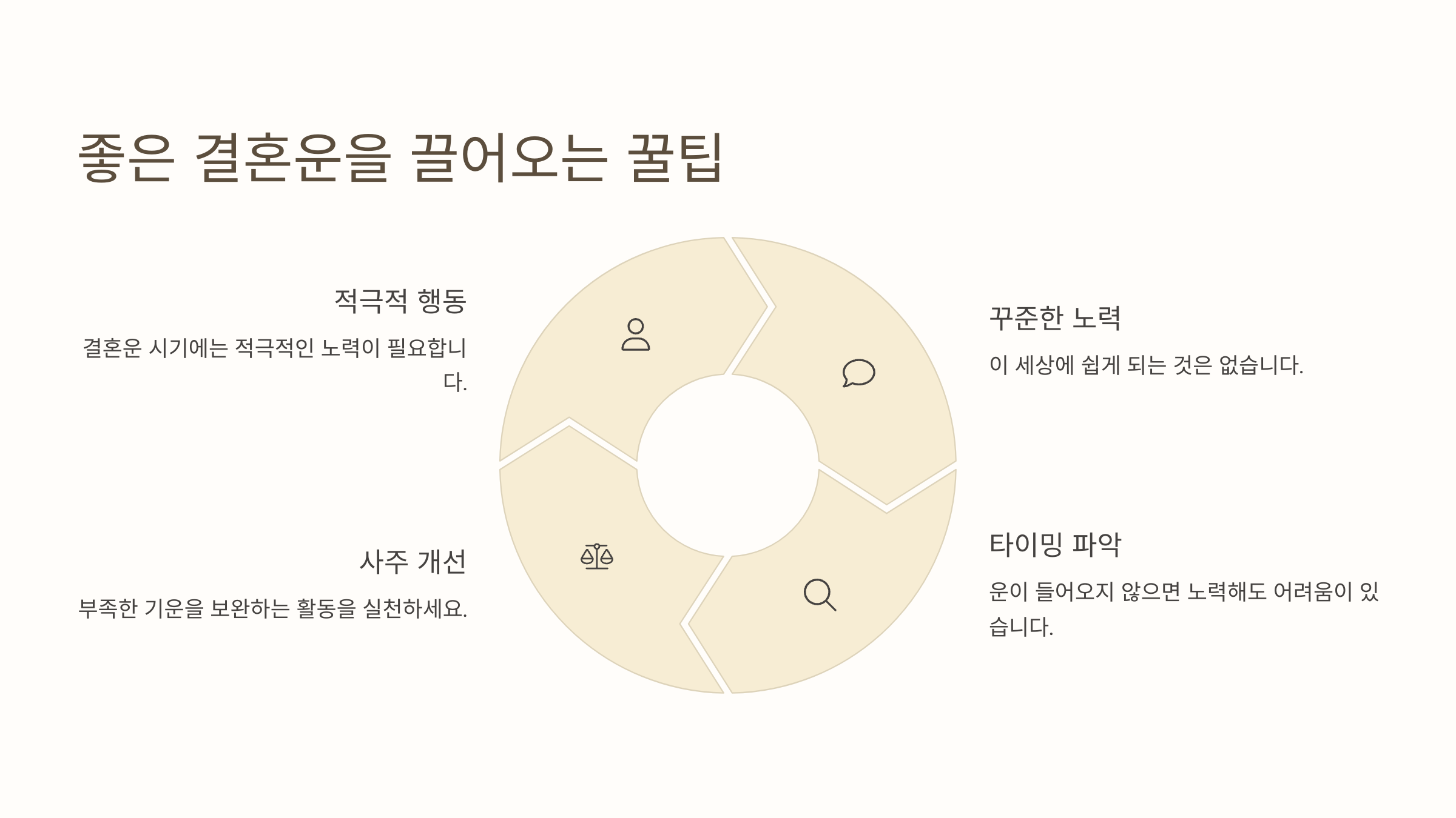 좋은 결혼운은 하늘에서 뚝 떨어지는 게 아니에요. 내 사주의 흐름과 기운을 이해하고, 그 흐름에 맞게 살아가는 것만으로도 인연은 자연스럽게 찾아온답니다. 특히 사주상 결혼이 늦는 유형이라면, 기운을 보완해주는 행동들이 중요한 역할을 해요. 결혼운은 마음가짐과 생활 습관에도 영향을 많이 받아요!첫 번째는 재성 보완이에요. 사주에서 재성이 약하거나 없을 경우, 금전이나 감정 표현에 인색해지는 경향이 있어요. 이럴 때는 실생활에서 재성을 끌어오는 색상, 방향, 음식 등을 활용해보는 것도 좋아요. 예를 들어 재성이 금(金)이라면 흰색, 은색 계열 옷을 자주 입거나 서쪽 방향을 활용하면 좋아요.