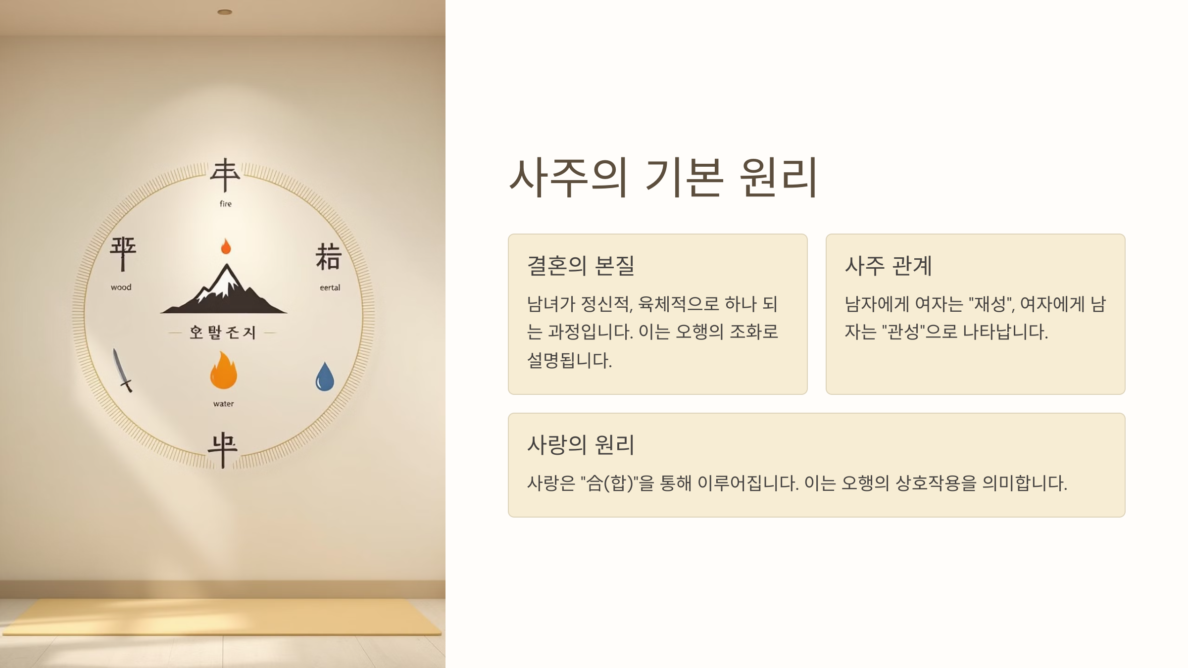 사주는 오행(목, 화, 토, 금, 수)이라는 다섯 가지 기운이 균형을 이루는 게 핵심이에요. 남자의 사주에서 결혼운은 보통 ‘재성’으로 판단하는데, 이 재성은 오행 중 본인의 일간(日干)을 기준으로 ‘극하는 오행’이에요. 즉, 일간이 목(木)이라면 금(金)이 재성이고, 일간이 수(水)라면 토(土)가 재성이 되는 식이죠.