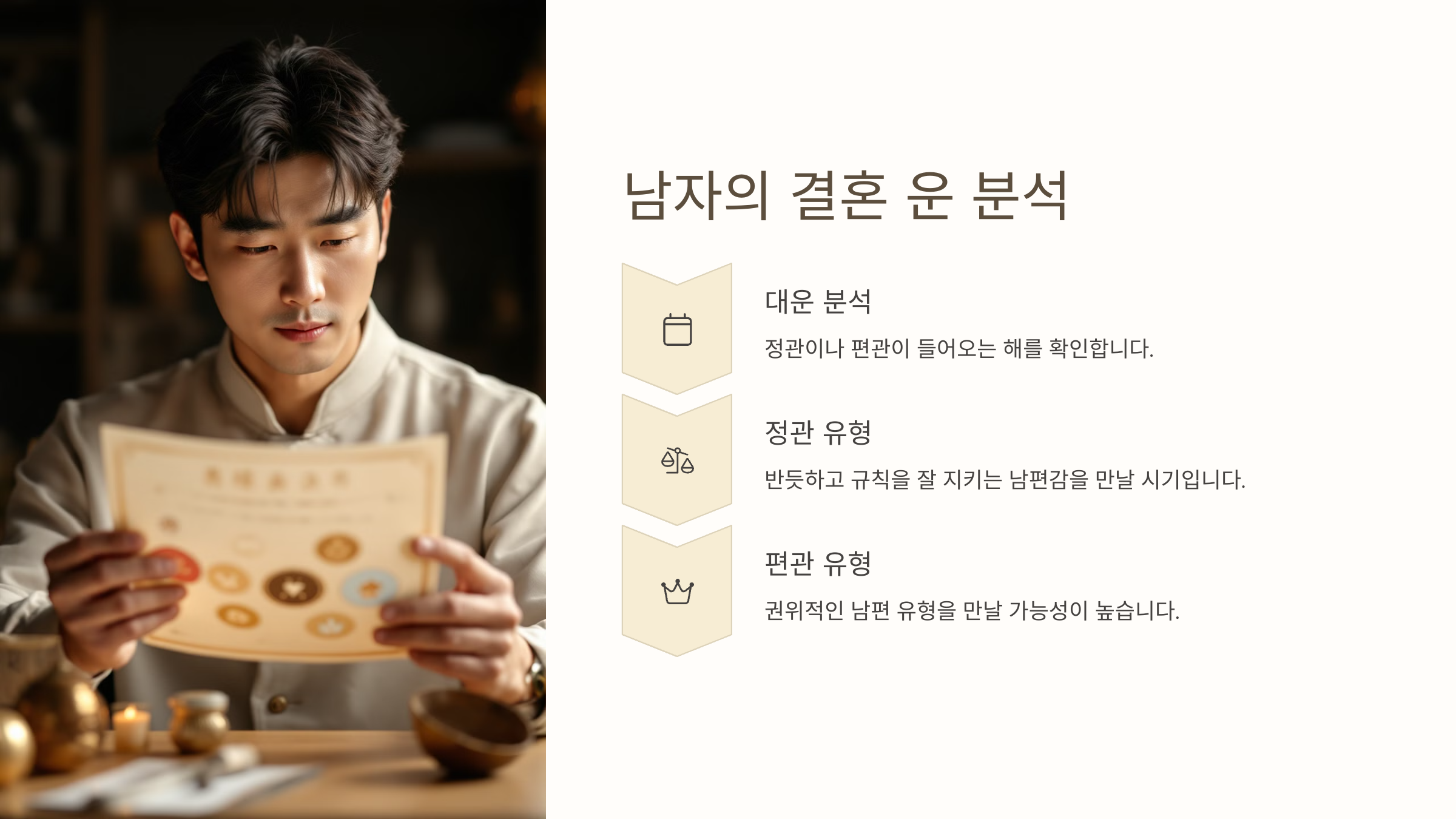 많은 사람들이 "언제쯤 결혼할까?"라는 고민을 한 번쯤 해봤을 거예요. 특히 남성분들 중에서는 진로를 먼저 다지고 안정된 후에 결혼을 계획하는 분들이 많다 보니, 결혼 시기가 자연스럽게 늦어지기도 하죠. 하지만 사주를 통해 본다면, 어떤 시기에 연애와 결혼의 기운이 강하게 들어오는지를 미리 알 수 있어서 전략적으로 준비할 수 있어요.