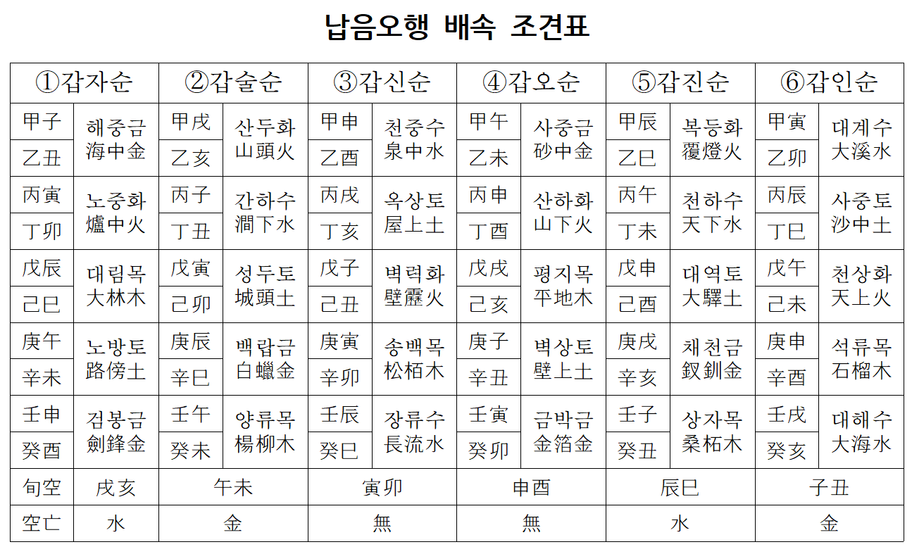 아래는 천간의 납음오행 배속 내용으로 배속된 오행을 참고해 보시기 바랍니다.