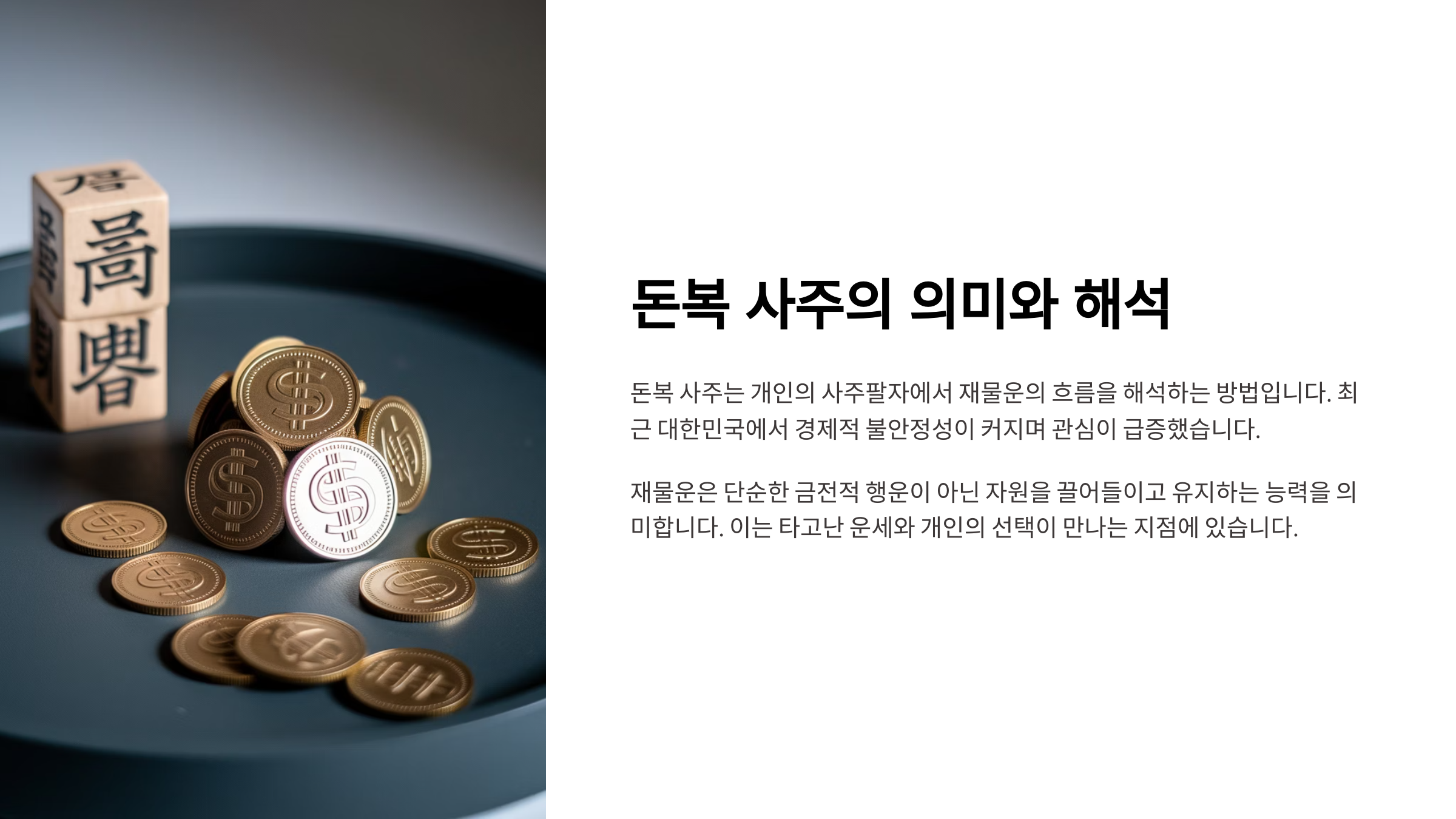 사주에서 말하는 ‘돈복’은 단순히 ‘돈이 많다’가 아니에요. 돈을 벌 기회, 자산을 움직이는 능력, 그리고 그 재물을 관리하는 힘까지 포함된 개념이죠. 하지만 현실은 그렇게 단순하지 않아요. 사주에 돈복이 있다고 해서 저절로 부자가 되는 건 아니랍니다. 오히려 '돈이 잘 빠져나가는 사주'일 수도 있고, ‘기회는 많은데 활용을 못 하는’ 경우도 많아요.