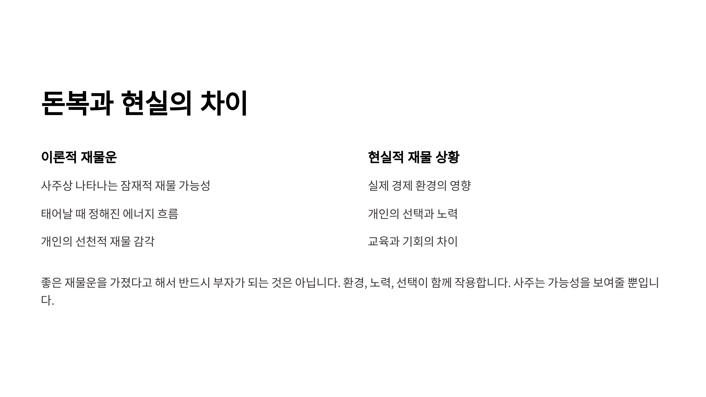 자, 이제 본격적으로 돈복 사주와 현실 간의 간극을 하나씩 짚어볼게요. 내가 생각했을 때 이 주제는 사주를 단순히 '운세'로 받아들이는 사람보다, 나를 이해하고 개선하려는 사람에게 훨씬 의미가 있어요.