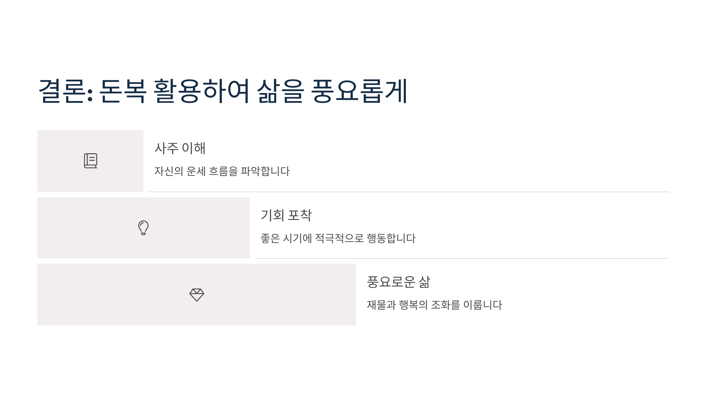 내 사주에 돈복이 있는지는 중요하지만, 그걸 어떻게 ‘운’과 타이밍에 맞춰 활용하느냐가 진짜 부자가 되는 핵심이에요 💎