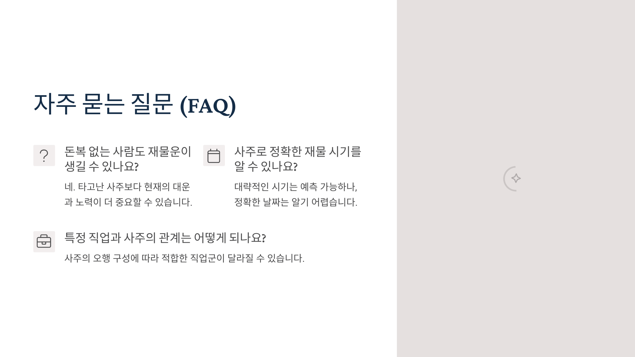 이제 마지막 박스에서 “내 사주 돈복 찾는 방법” + FAQ 8개 + 태그 10개 정리해드릴게요!