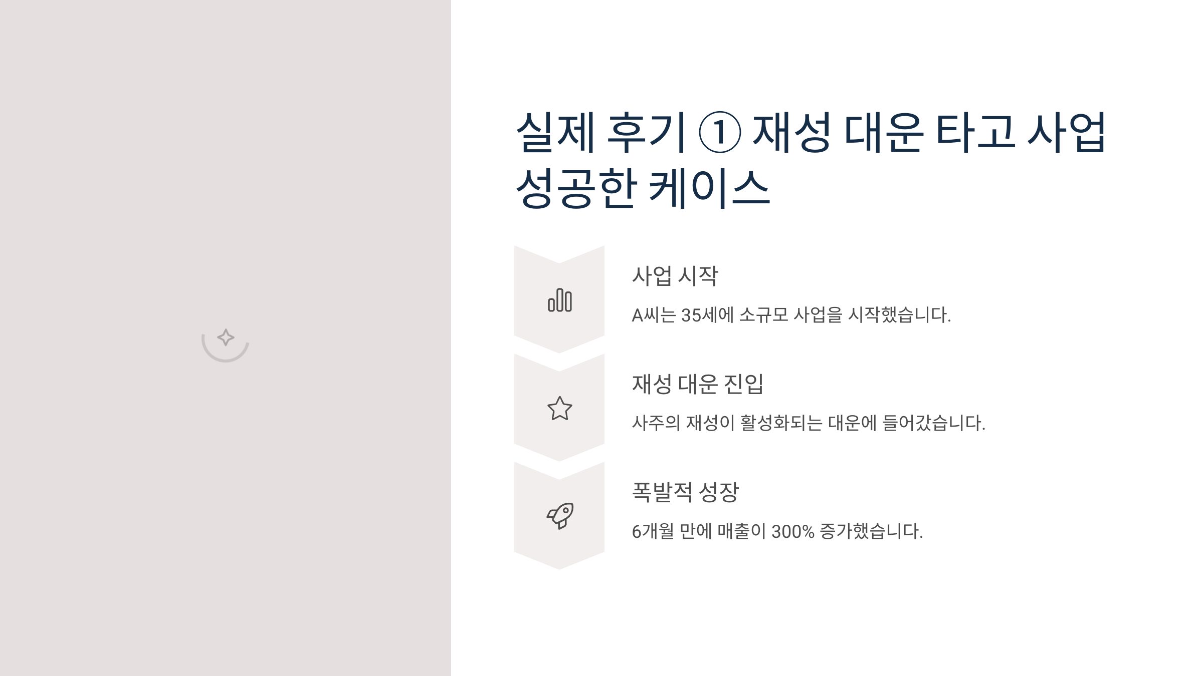 이 사례는 40대 초반 여성 A씨의 이야기예요. 평범한 직장인이었지만, 대운이 바뀌면서 갑자기 사업 아이템이 떠오르고 과감히 퇴사 후 창업을 결심했죠.