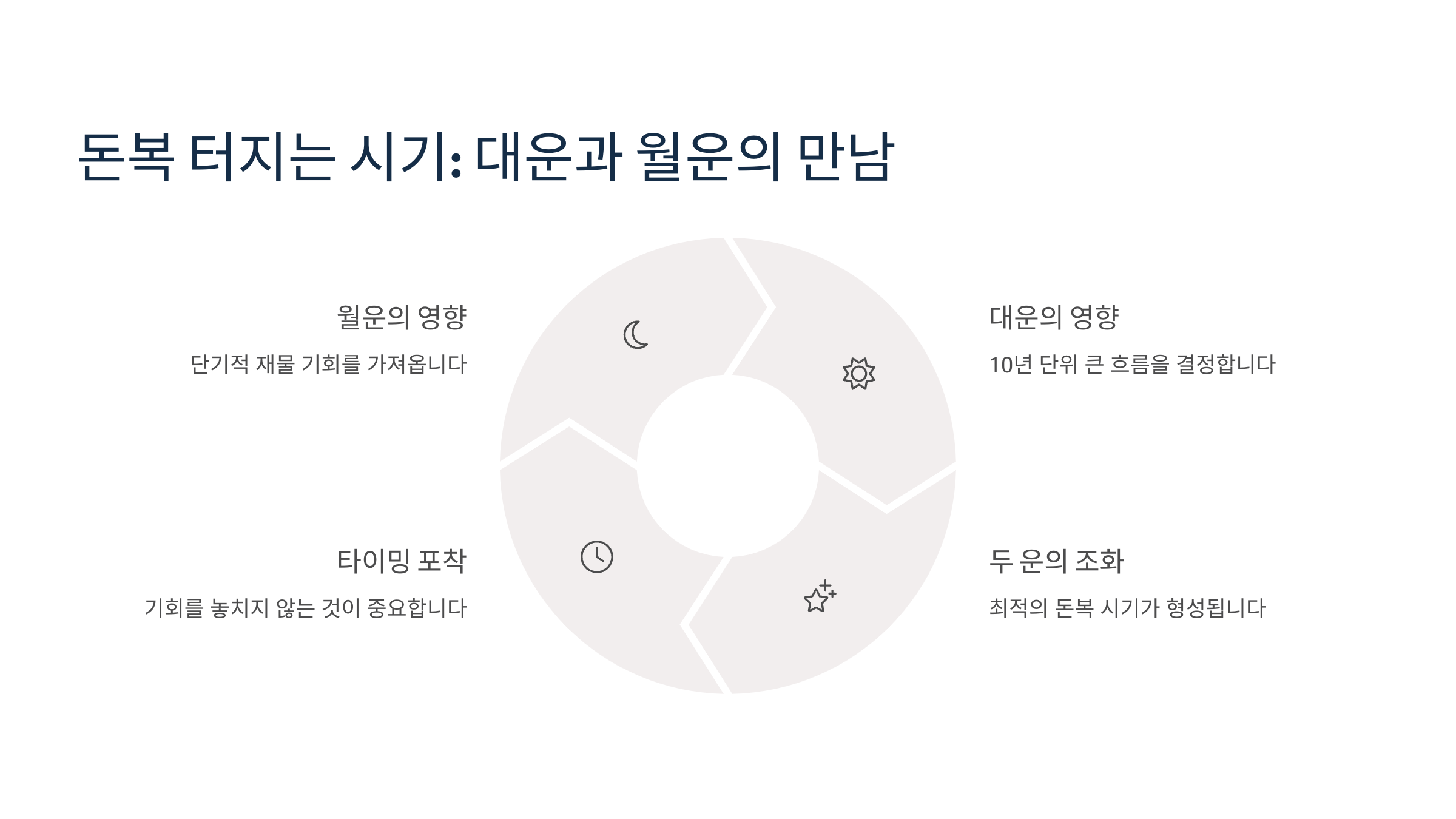 사주에서 ‘돈복 터지는 시기’는 대부분 대운의 큰 흐름과, 그 해의 세운 또는 월운이 재성과 맞물릴 때 발생해요.