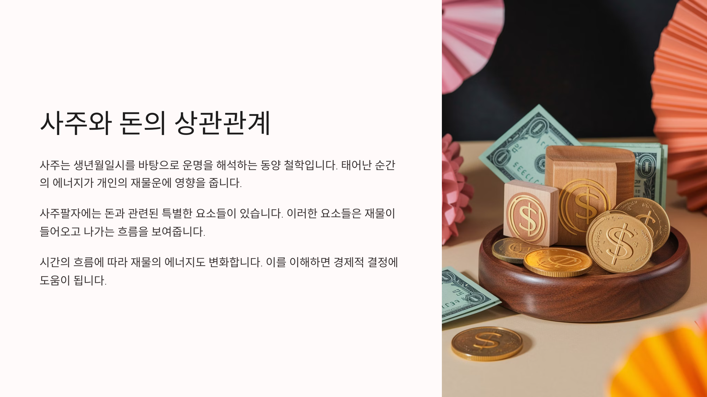 사주에서 재물운은 단순히 '돈이 들어온다'는 의미보다 훨씬 더 깊은 뜻을 가지고 있어요. 나의 타고난 성향, 에너지 흐름, 운의 주기 등 여러 요소들이 '돈을 어떻게 다루고 벌 수 있는지'를 보여주거든요. 이를테면 어떤 사람은 창업에 유리하고, 또 어떤 사람은 조직 생활에서 돈을 잘 벌 수 있는 유형이죠.