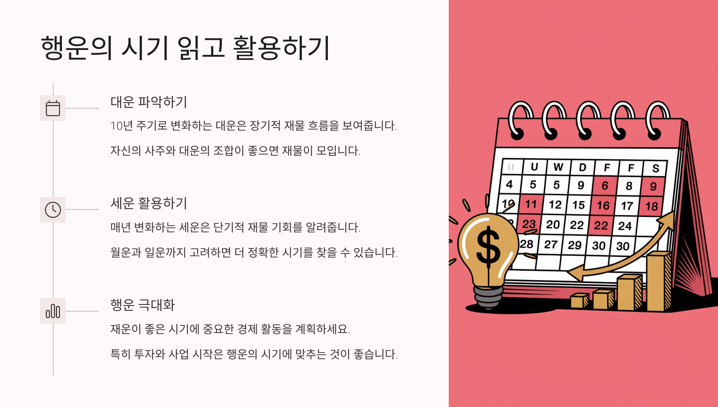 이제 사주의 기초 개념만 익혀도 내 재물운을 읽는 눈이 생겨요. 사주는 마치 내 삶의 지도를 읽는 느낌이에요. 다음 섹션에서는 이걸 바탕으로 ‘행운의 타이밍’을 어떻게 잡을 수 있는지 알려줄게요! 🗓️