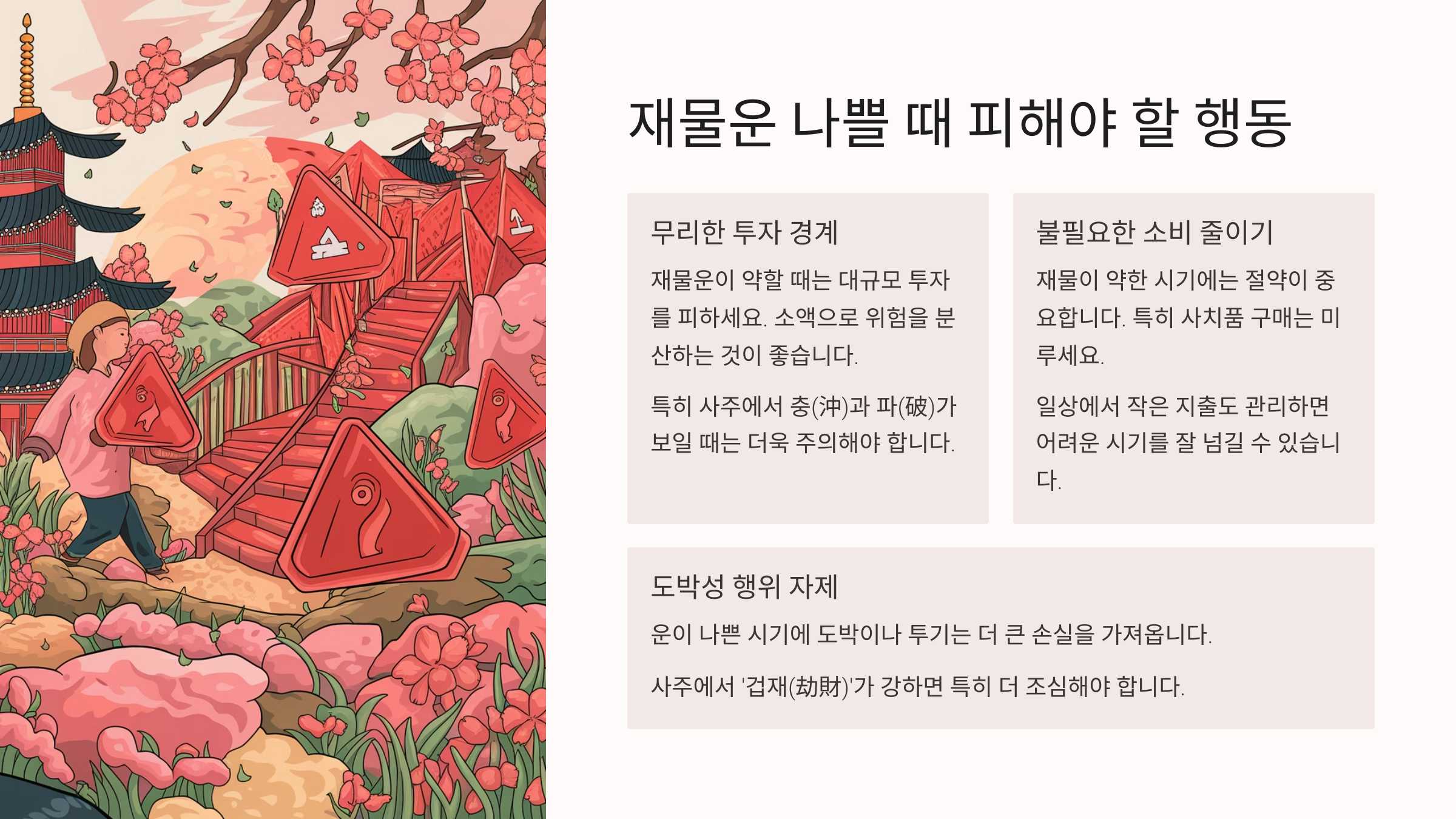 사주는 흐름이에요. 흐름이 좋을 땐 원하는 방향으로 잘 풀리지만, 흐름이 꺾였을 땐 뜻하지 않은 지출, 손해, 사기까지도 경험할 수 있어요. 이럴 때 가장 중요한 건 ‘조심’이에요. 돈이 빠지는 시기에는 절대적으로 피해야 할 행동들이 있어요.