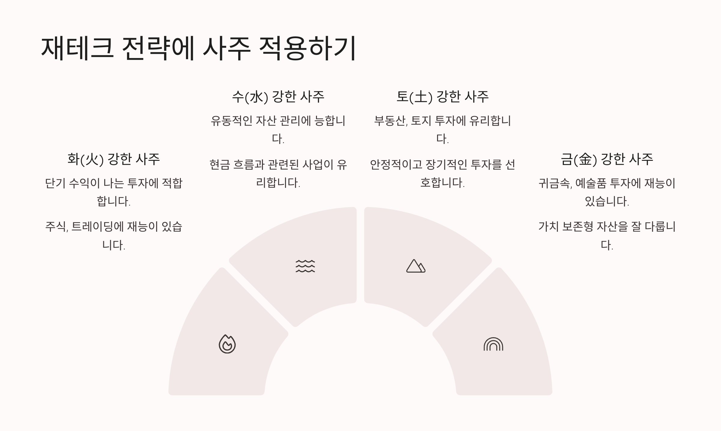 이제 내 사주의 재물운을 파악하고, 운의 흐름까지 읽을 수 있게 되었다면, 실제 재테크 전략에 어떻게 적용할지 구체적으로 알아볼 차례예요. 사주 기반 재테크는 ‘타이밍 + 성향 맞춤’이 핵심이에요. 쉽게 말해, 나에게 맞는 투자 방식과 그걸 실행하기에 좋은 시기를 정하는 거죠.