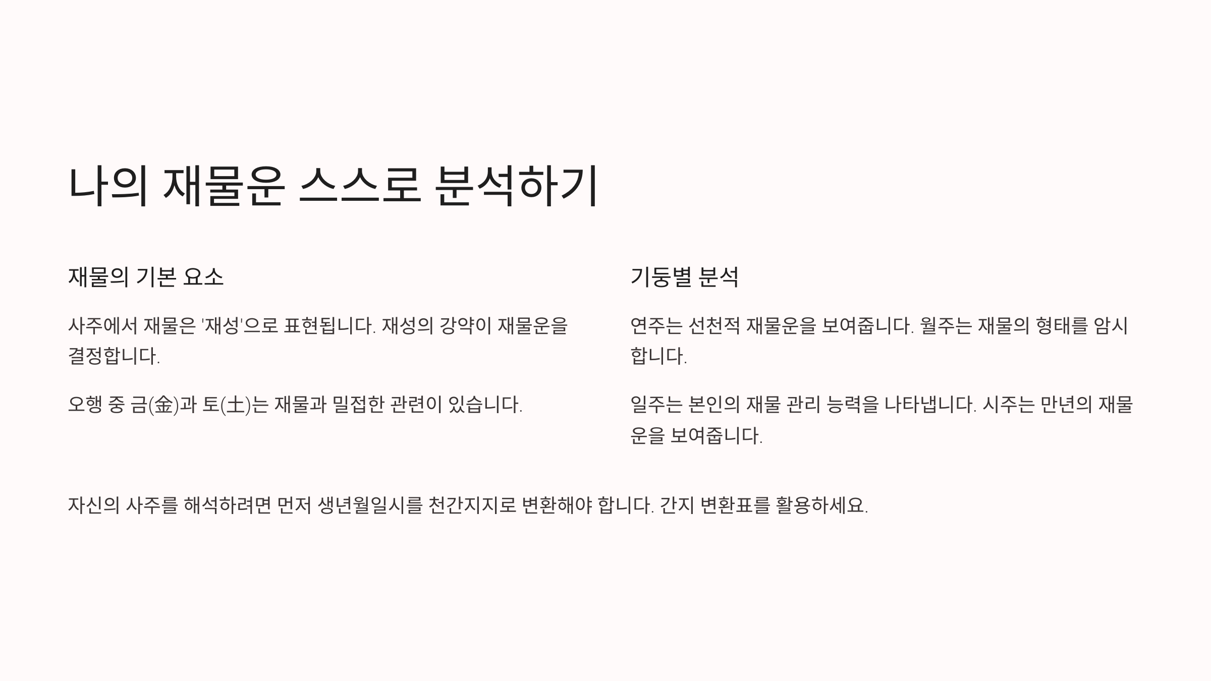 구성 요소 의미 분석 포인트 일간 자신의 본성 재성과의 관계 재성 돈, 자산 강약, 위치 대운 10년 주기 흐름 재운 시기 파악 이제 사주의 기초 개념만 익혀도 내 재물운을 읽는 눈이 생겨요. 사주는 마치 내 삶의 지도를 읽는 느낌이에요. 다음 섹션에서는 이걸 바탕으로 ‘행운의 타이밍’을 어떻게 잡을 수 있는지 알려줄게요! 🗓️