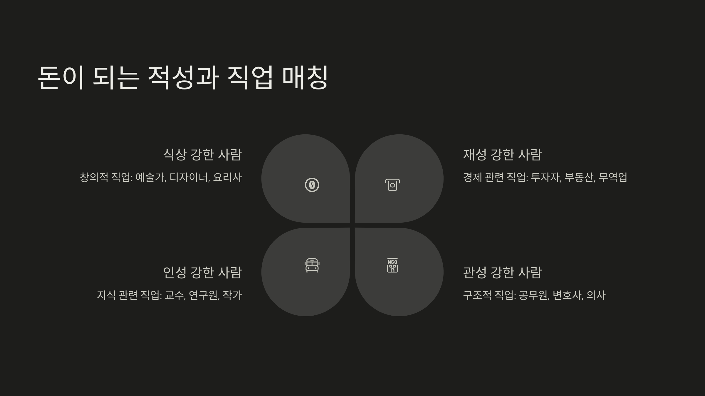 ✔ 식상이 강한 사람: 기획, 창작, 강의, 콘텐츠 ✔ 재성이 강한 사람: 투자, 유통, 부동산, 자산관리 ✔ 관성이 강한 사람: 조직 내 관리자, 공무원, 안정적 시스템 ✔ 인성이 강한 사람: 교육, 상담, 심리, 연구분야