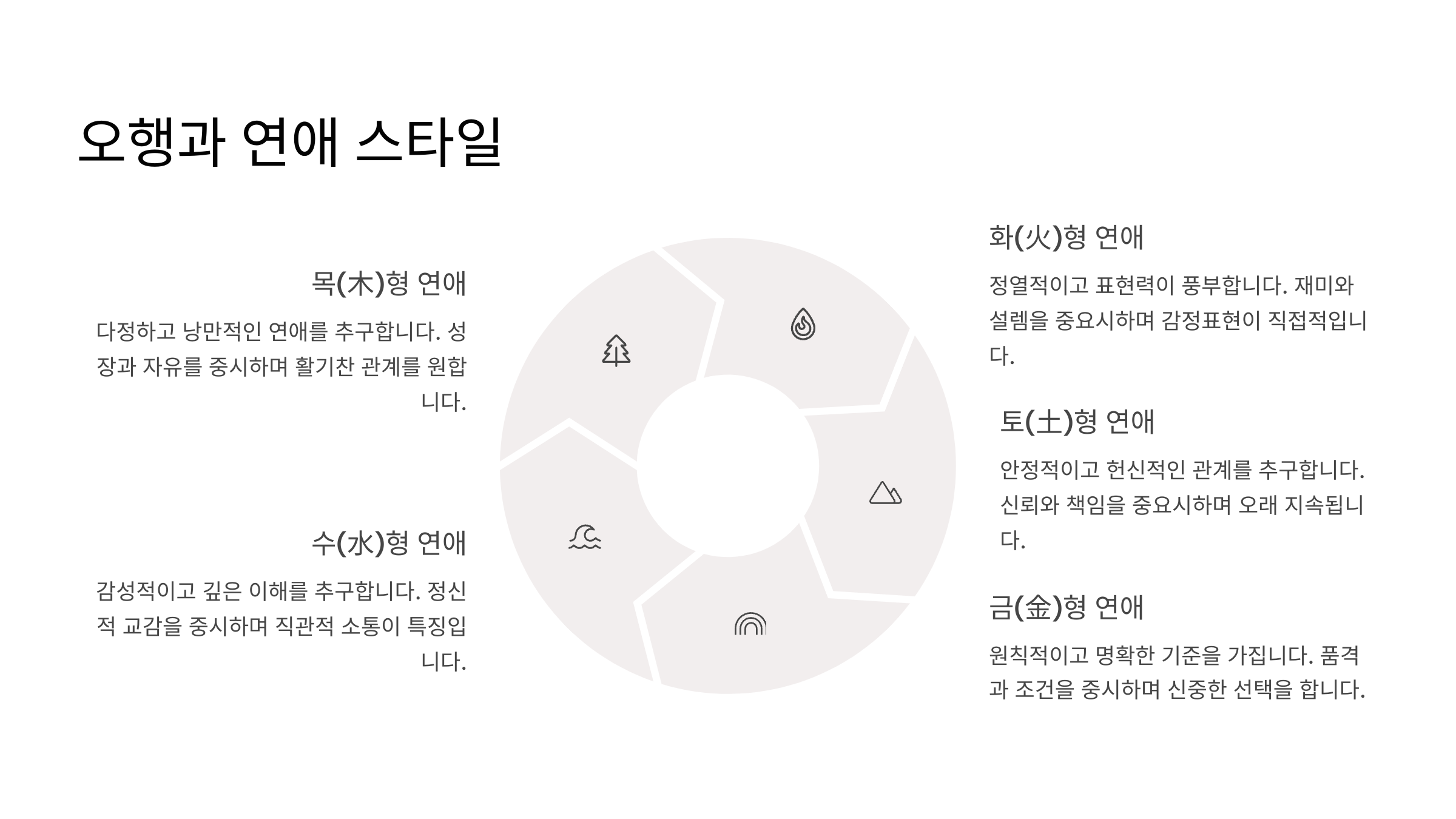토(土)는 안정과 신뢰를 중시해서 신중한 연애를 하며, 금(金)은 이성적이고 원칙적인 사랑을 해요. 수(水)는 감정이 풍부하고 상대에게 깊이 빠지는 타입이에요. 이 오행들이 서로 어떻게 어울리는지도 궁합에서 중요한 요소로 작용해요.