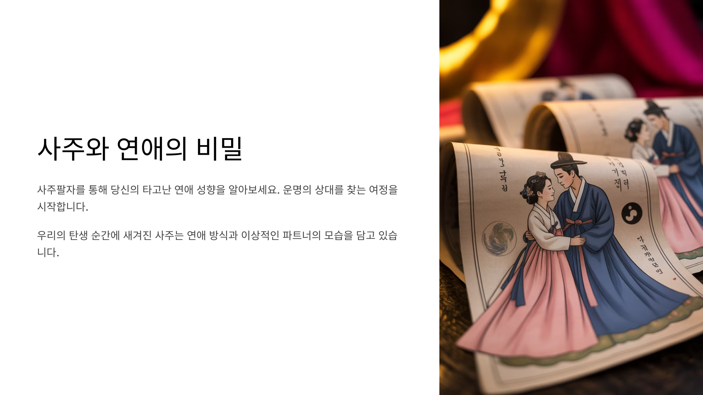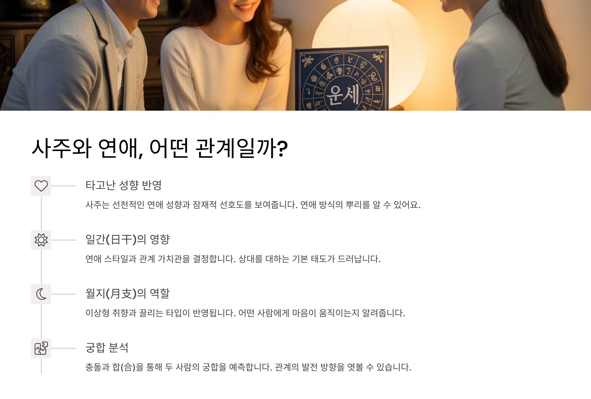 이처럼 사주는 나 자신을 이해하고 상대와의 관계를 조화롭게 만들기 위한 훌륭한 지침서예요. 사주를 알면, 연애에서 실수하는 패턴도 미리 파악하고 조율할 수 있어요.