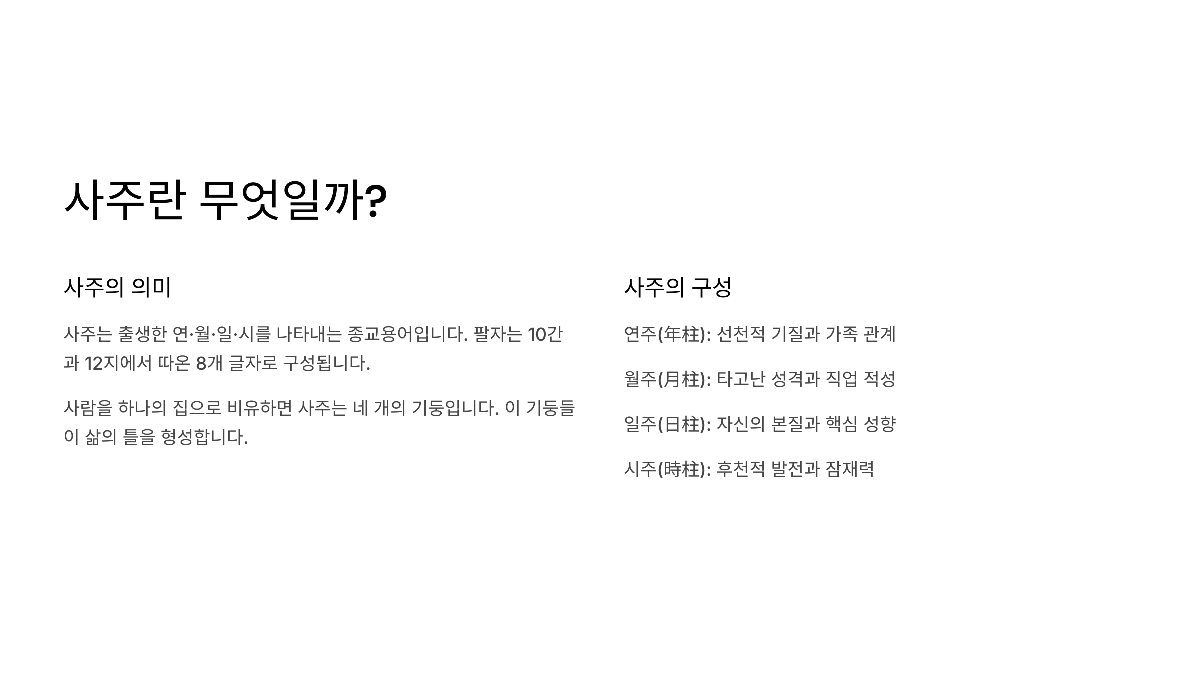 사주란 무엇일까 사주는 '네 개의 기둥'이라는 뜻을 지닌 '사주팔자'에서 유래했어요. 여기서 말하는 네 개의 기둥은 태어난 연도, 월, 일, 시를 기준으로 한 천간과 지지로 구성되어 있어요. 즉, 총 8개의 글자로 운명을 해석하는 전통적인 동양 역학 시스템이죠.