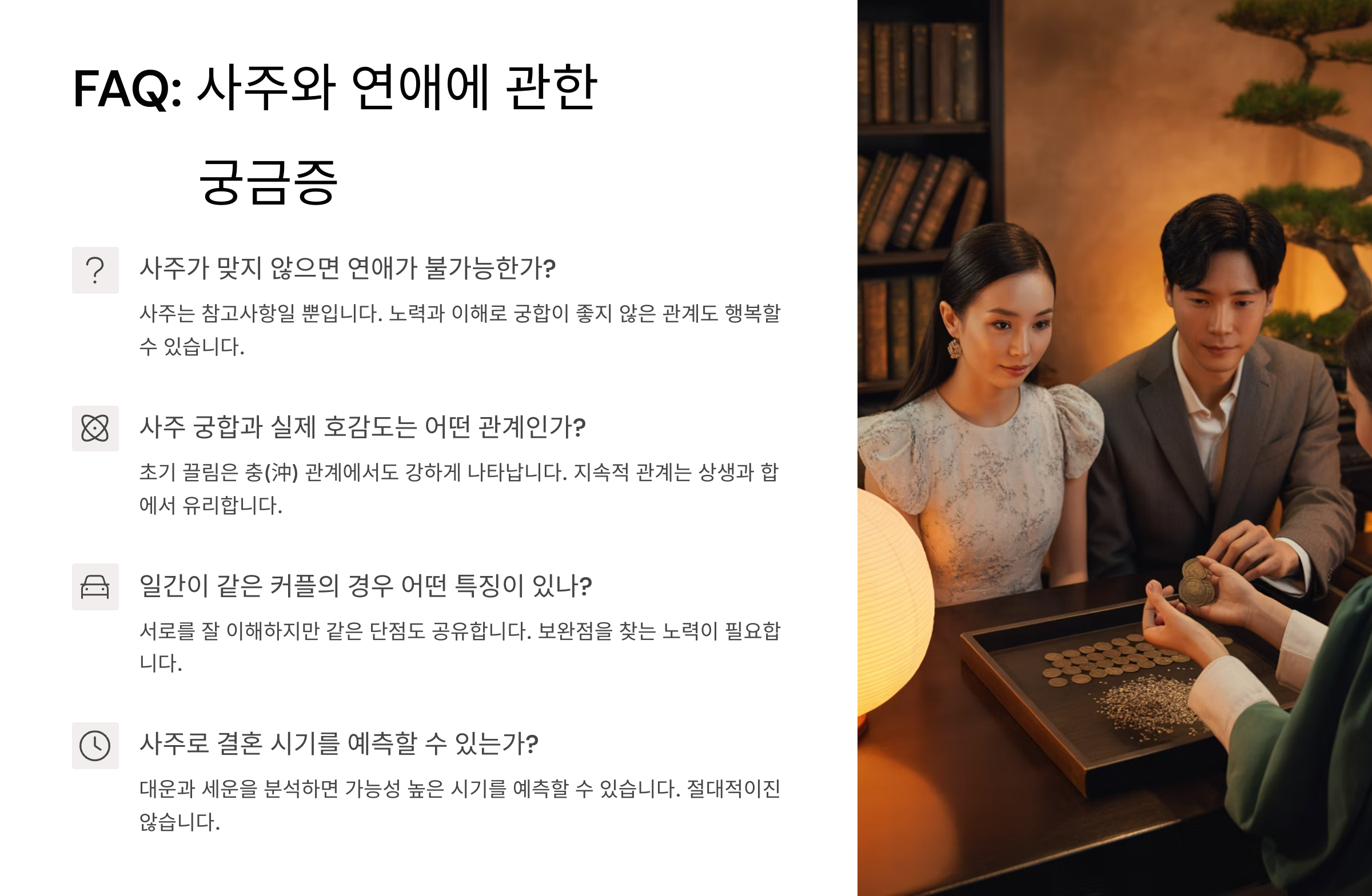 이제 마지막으로, 사람들이 가장 많이 묻는 사주 연애 관련 질문들을 FAQ로 정리해서 알려드릴게요! 지금 딱 궁금한 질문일지도 몰라요✨