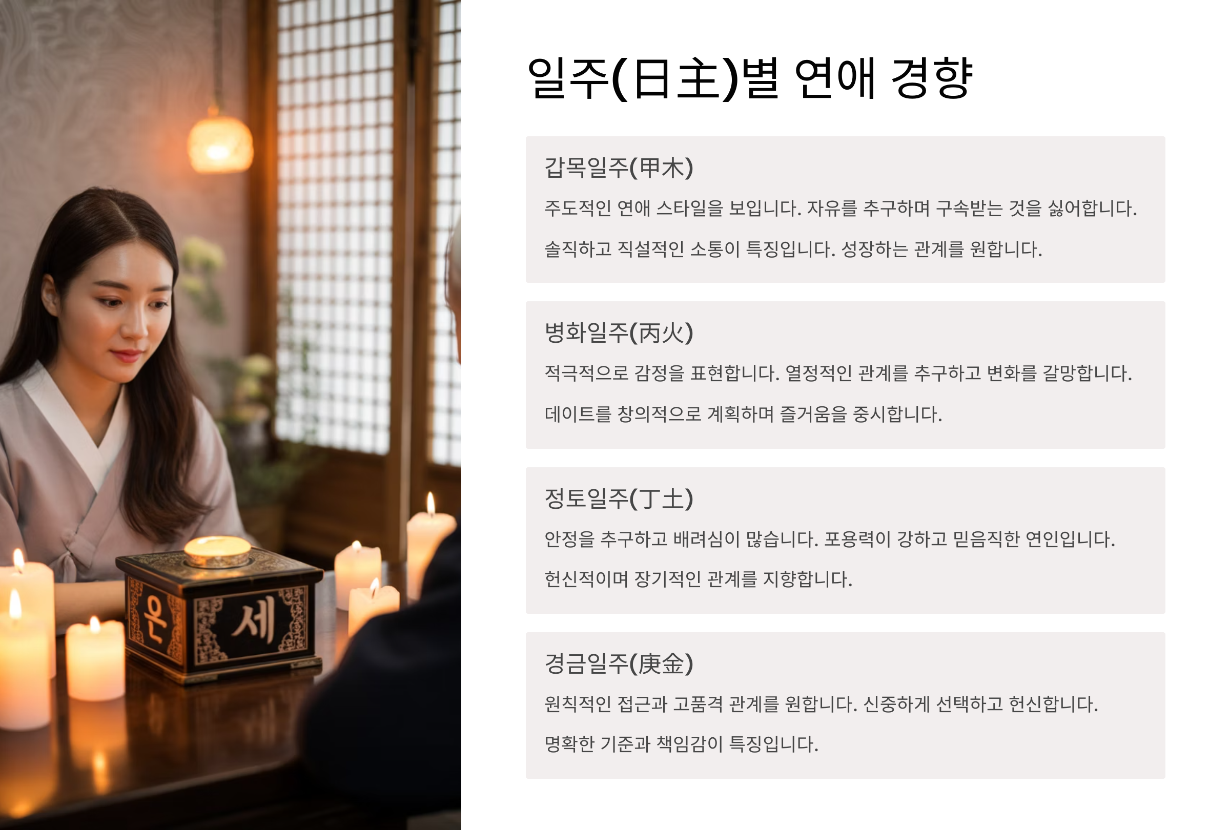 이제 다음으로는 일주(日主)에 따라 연애 경향이 어떻게 달라지는지 알아볼 거예요! 일주는 사주의 중심이라 더욱 정확한 분석이 가능하거든요💡