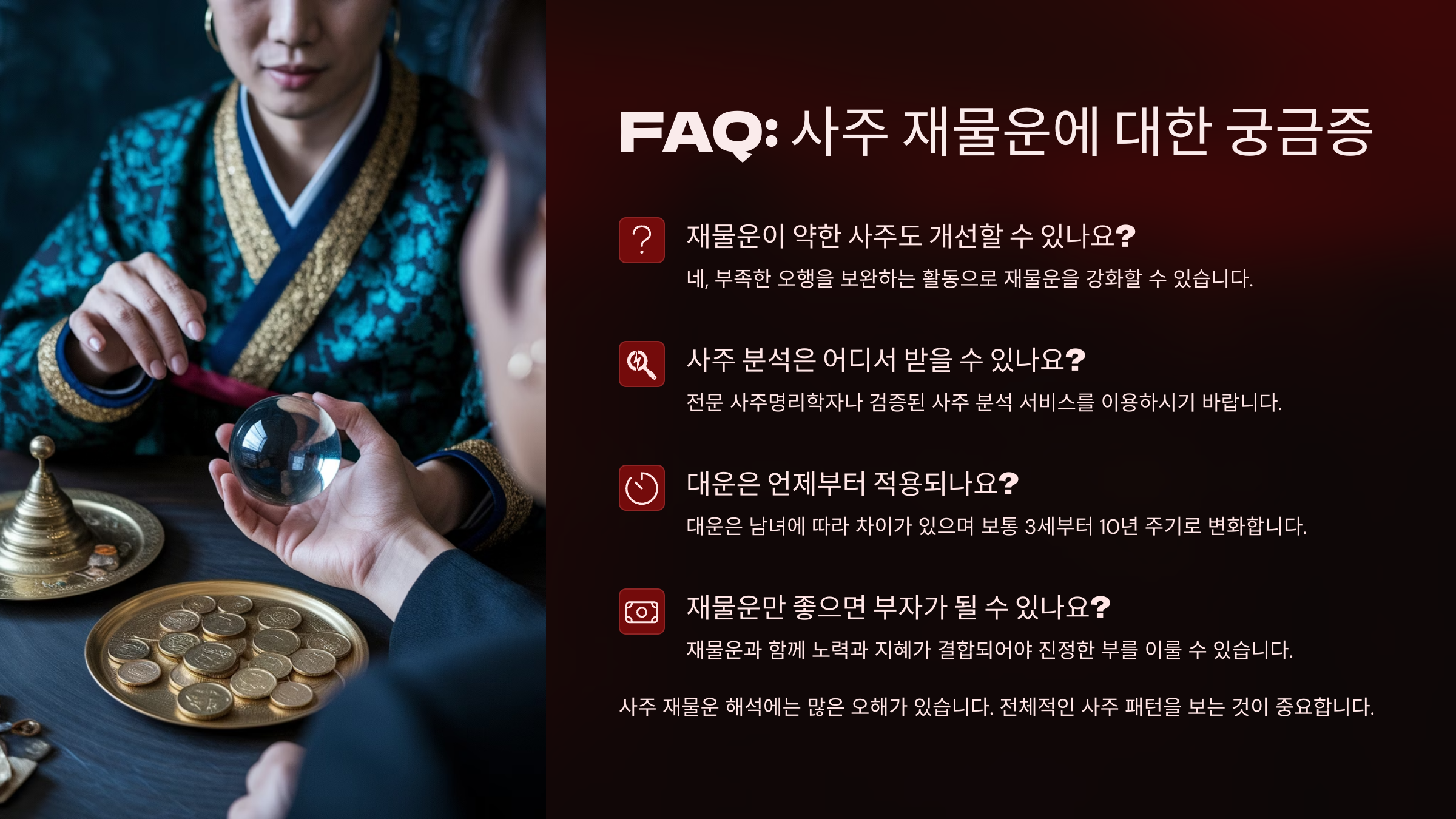 A1. 사주는 통계와 기운의 흐름을 기반으로 하기 때문에 100% 예언은 아니지만, 재물운의 흐름과 타이밍을 파악하는 데 꽤 유용한 도구예요.