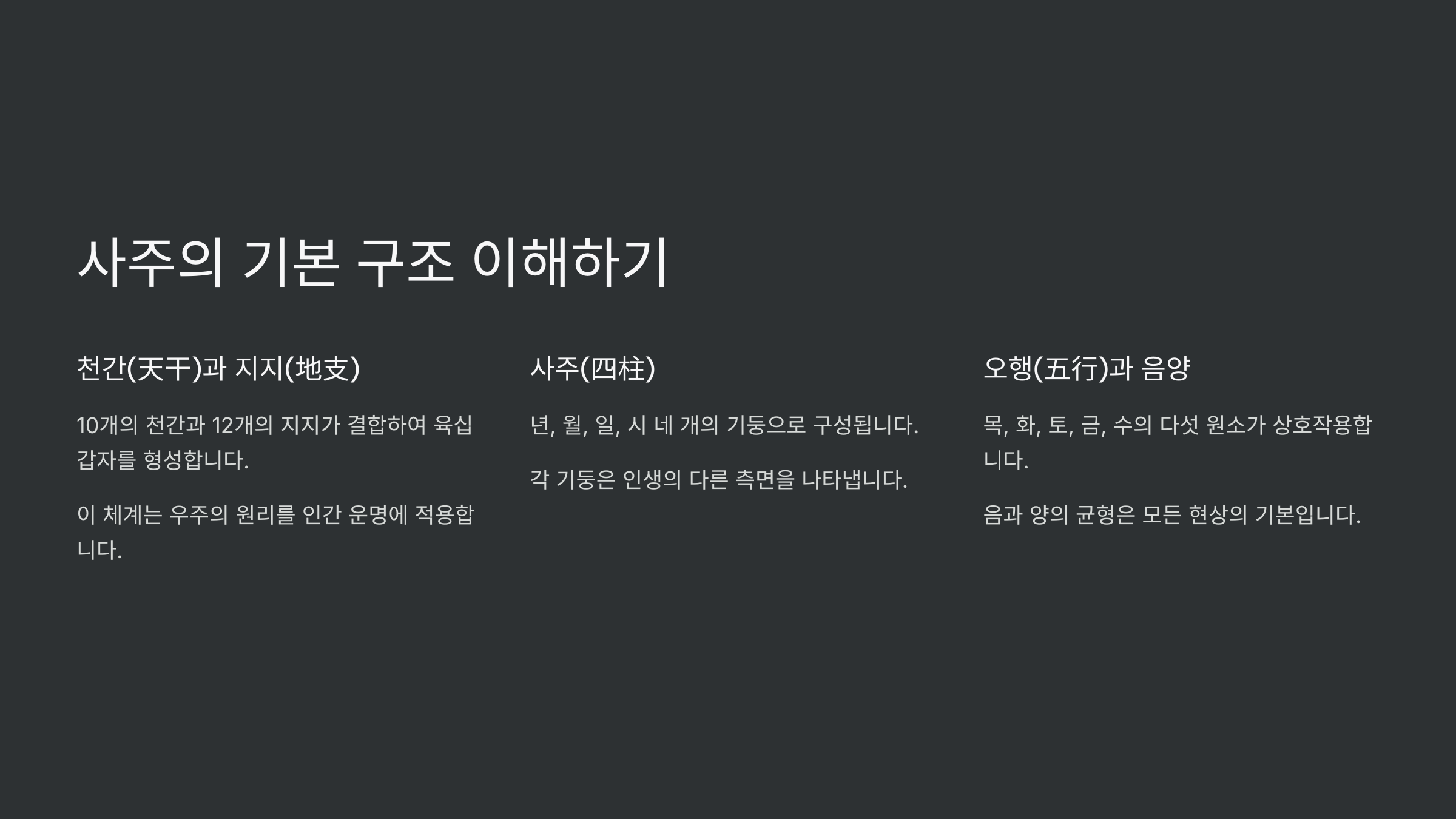 사주는 총 네 기둥으로 구성돼요. 연주(태어난 해), 월주(월), 일주(일), 시주(시간)가 그것인데, 각각의 기둥은 '천간'과 '지지' 한 쌍으로 이뤄져 있어요. 그래서 총 8개의 글자, 즉 팔자라고 부르죠. 이 여덟 글자가 서로 어떤 관계를 맺고 있는지를 해석하는 것이 사주의 핵심이에요.
