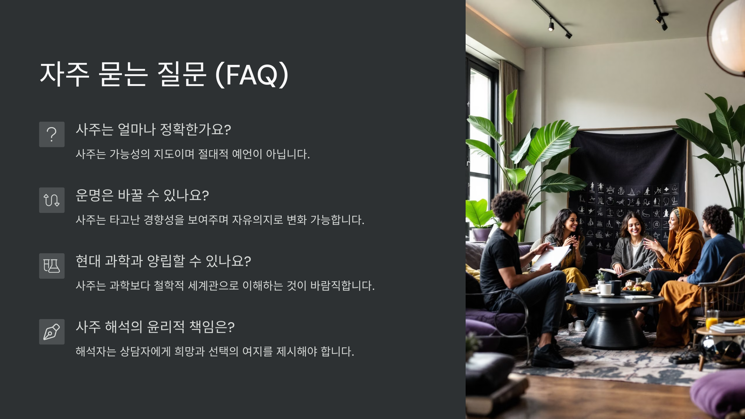 A6. 사주는 통계와 철학의 결합이기 때문에 모든 상황에 정확하다고는 말할 수 없어요. 하지만 흐름을 읽고 인생을 정리하는 데 큰 힌트를 줄 수 있어요.