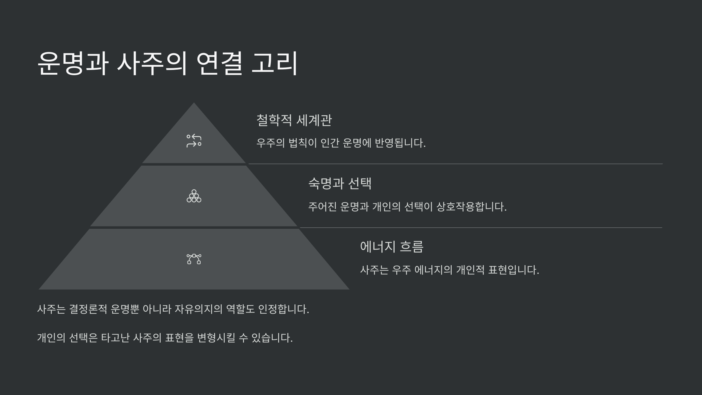 또한 사주는 유교적 가치관과도 연결돼 있어요. 인간은 천명(하늘의 명)을 가지고 태어난다는 생각이 사주의 핵심이에요. 그래서 사주는 자신의 삶의 흐름을 이해하고, 더 나아가 조화로운 방향으로 나아가기 위한 하나의 도구로 활용될 수 있어요. 자신의 기질과 운세를 알면, 어떤 시기에 어떤 선택을 해야 할지 도움을 받을 수 있답니다.