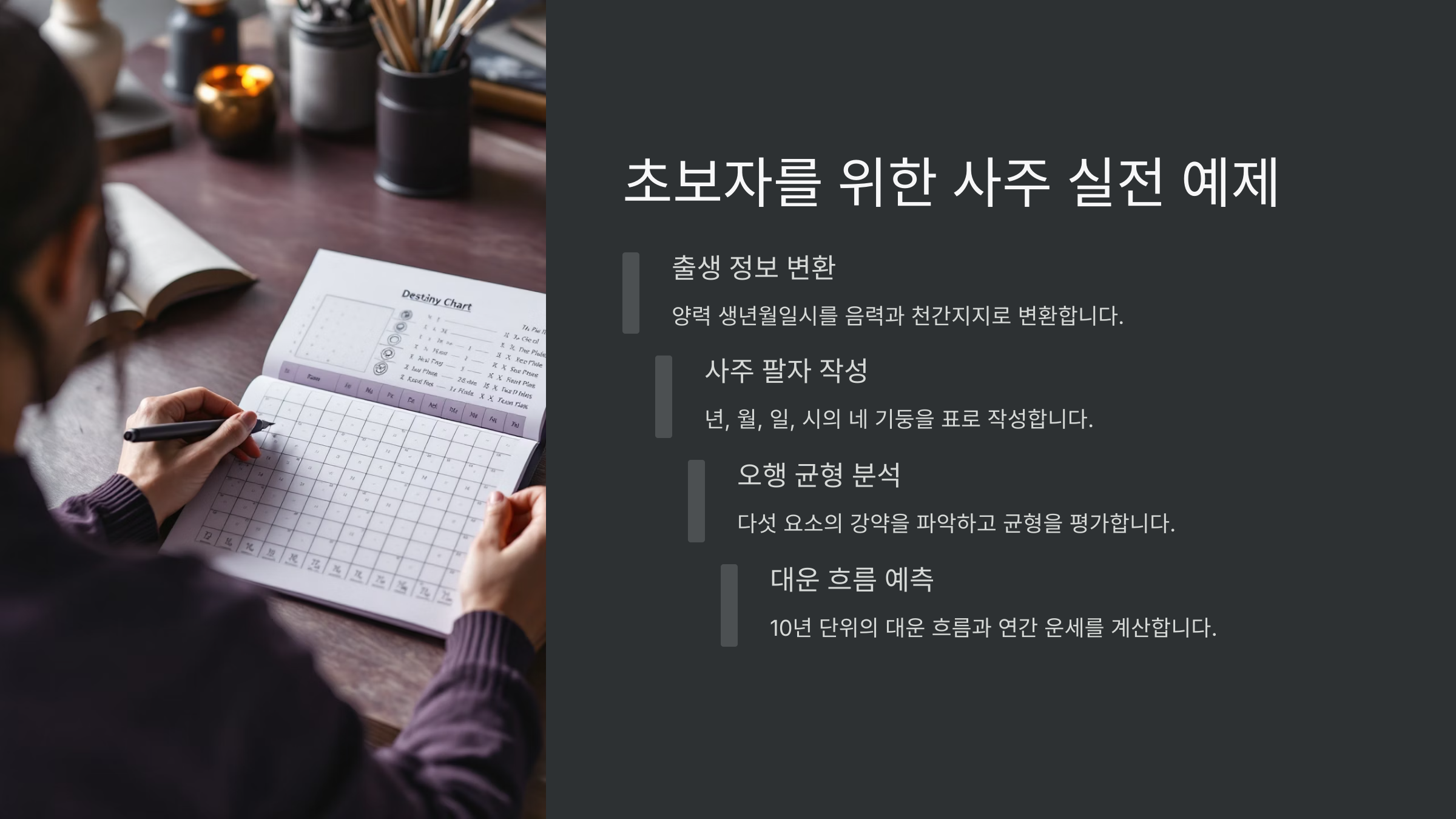가장 먼저 추천하는 방법은 **'내 사주부터 보기'**예요. 내 사주를 기반으로 하나씩 천간과 지지를 분석하고, 오행의 흐름을 살펴보는 거죠. 그러다 보면 자연스럽게 패턴이 눈에 들어오고, 어떤 조합이 좋은지, 어떤 조합이 충돌하는지도 익히게 돼요.