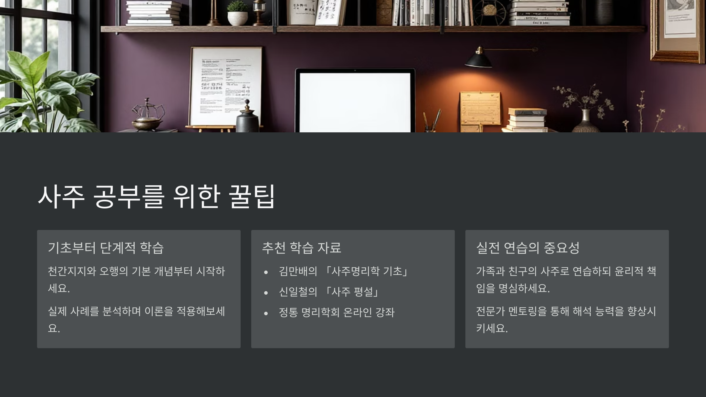 추천 방법 설명 이점 내 사주 분석 자신의 팔자부터 분석해보기 실전 감각 익히기 일간 중심 이해 10개 일간의 성격, 기질 파악 사주 중심 해석 가능 실전 예제 반복 학습 유튜브/서적 참고 실력 향상, 감각 UP 이 꿀팁들만 잘 따라도 사주를 재미있게, 그리고 꾸준히 공부할 수 있어요. 사주는 어려운 학문 같지만, 알고 보면 인생을 더 깊이 이해할 수 있게 도와주는 따뜻한 지혜예요 🌿