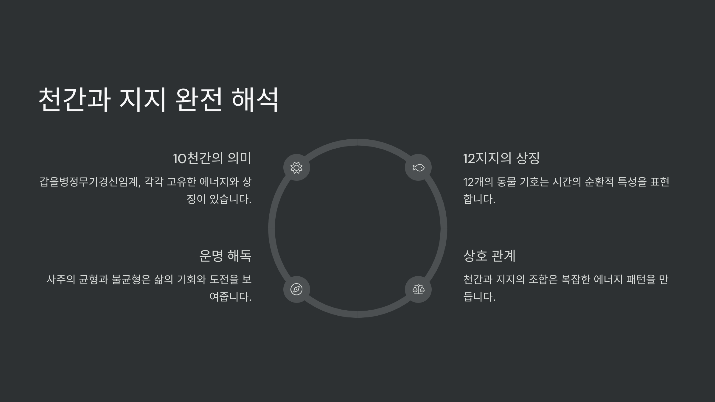 천간과 지지가 짝을 이루는 방식은 우주 에너지의 조화를 표현한 것이라고 볼 수 있어요. 이 조합을 해석할 줄 알면, 사주의 큰 흐름을 파악할 수 있답니다. 특히 사주풀이에서는 각 간지의 성향, 오행의 균형, 음양의 조화를 중심으로 해석을 진행해요.