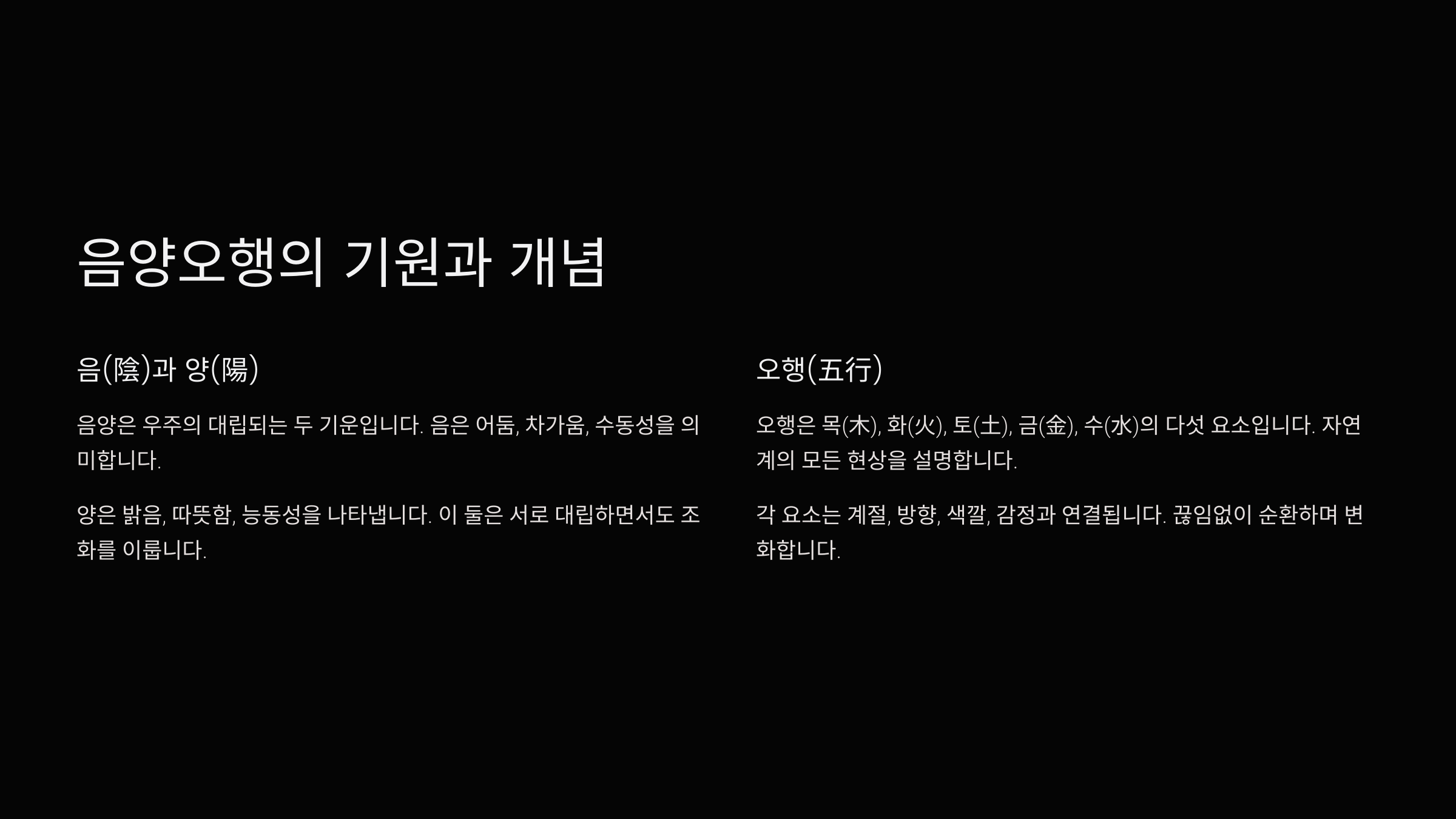 내가 생각했을 때, 이 음양오행 개념은 인간과 자연이 하나로 연결돼 있다는 동양적인 사고방식을 참 잘 보여주는 것 같아요. 사람의 인생도 자연처럼 흘러가고 변화한다는 걸 느끼게 해주거든요 🌿