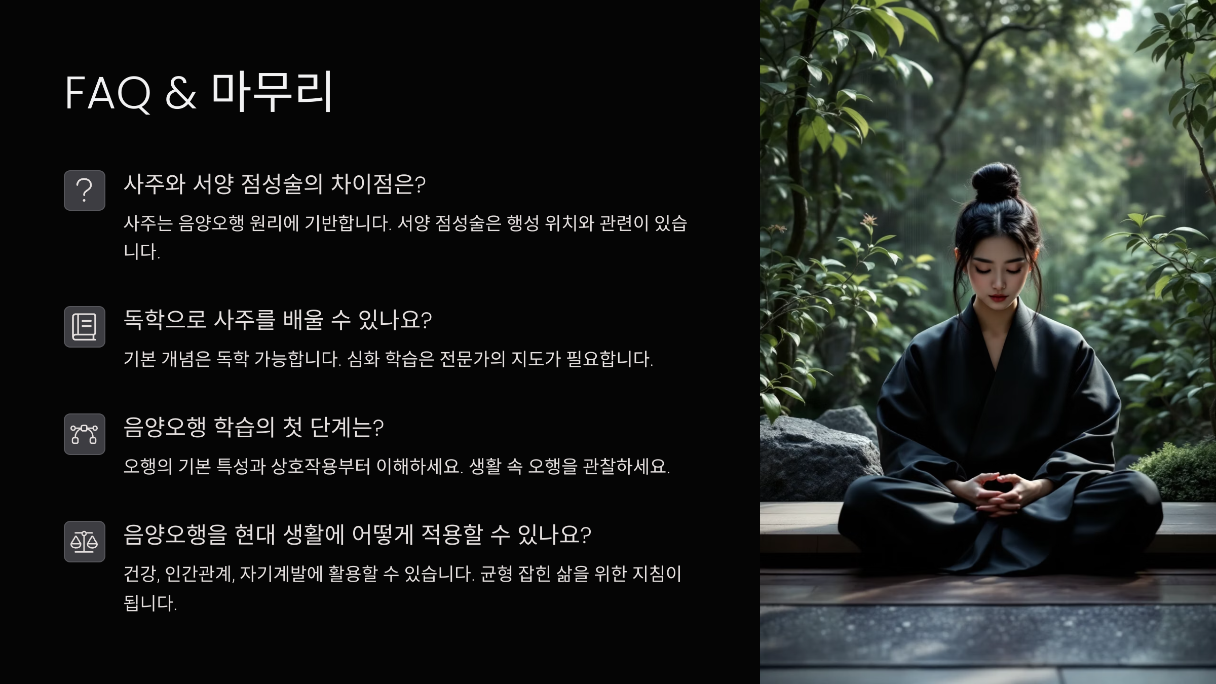 Q1. 사주에서 오행이 아예 없는 경우도 있나요?A1. 네, 특정 오행이 하나도 없는 경우도 있어요. 이런 경우 그 오행에 해당하는 에너지가 부족하다고 보고, 해당 오행을 보완하는 대운이나 세운이 들어올 때 삶의 흐름이 좋아질 수 있어요.