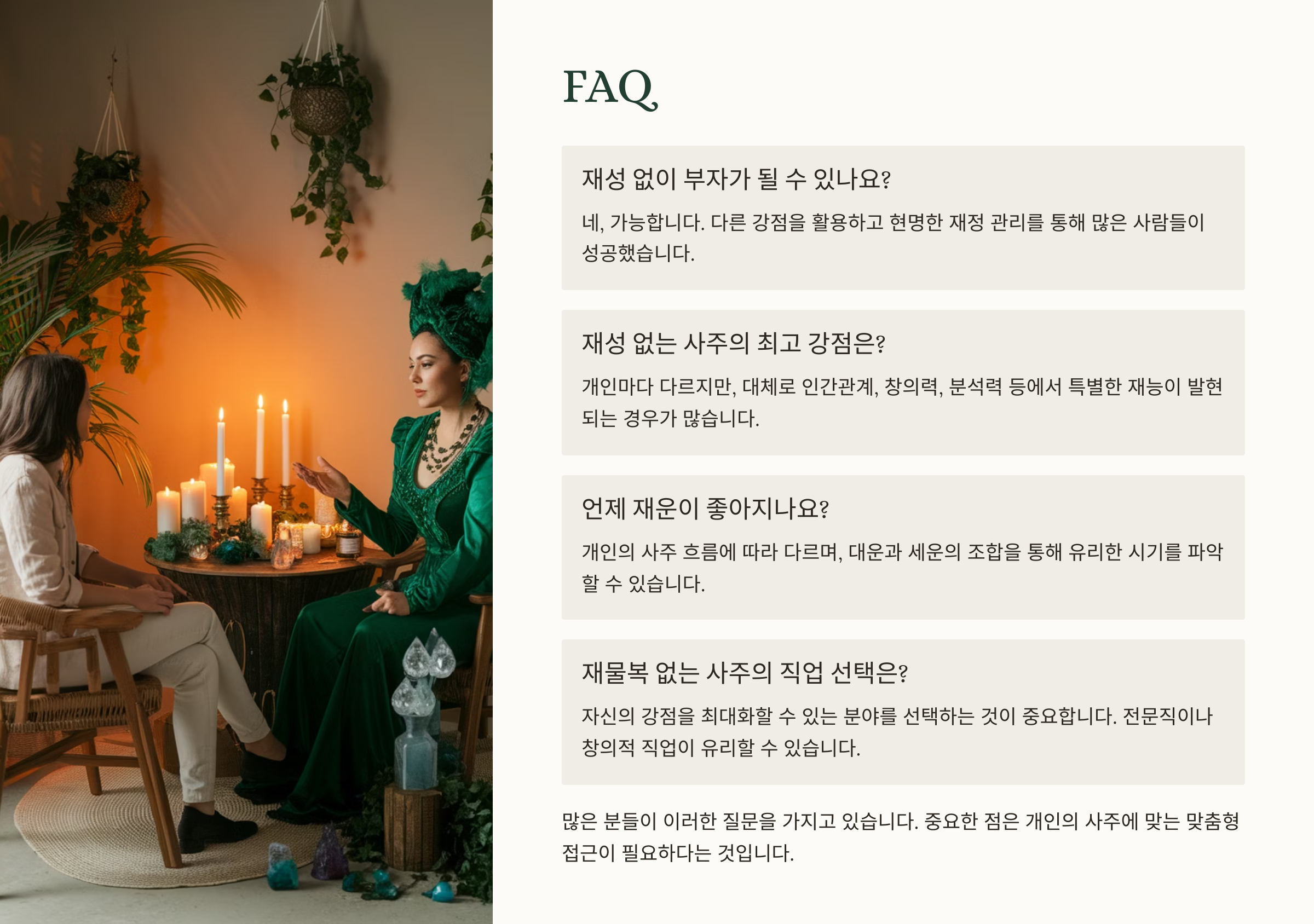 하지만 진실은 이래요. 재성이 없다는 건 단지 ‘물질을 향한 집착이 약하다’는 의미일 뿐, 절대 가난이 확정된 건 아니에요.