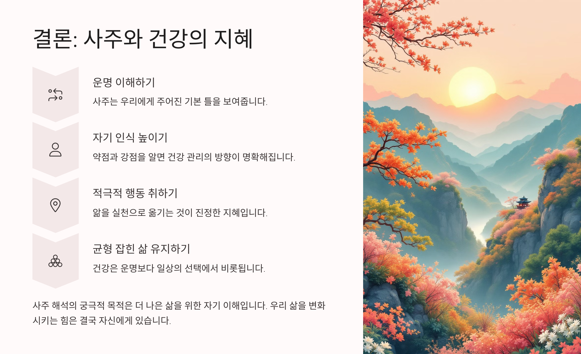 병이 많은 사주라면 ‘균형 잡기’가 인생의 중요한 과제가 돼요. 이는 단순한 건강 관리 차원을 넘어서, 감정, 인간관계, 사고방식까지 포괄하는 문제예요. 사주를 보면서 이런 균형을 찾는다면 인생의 흐름이 훨씬 편안해질 수 있어요.