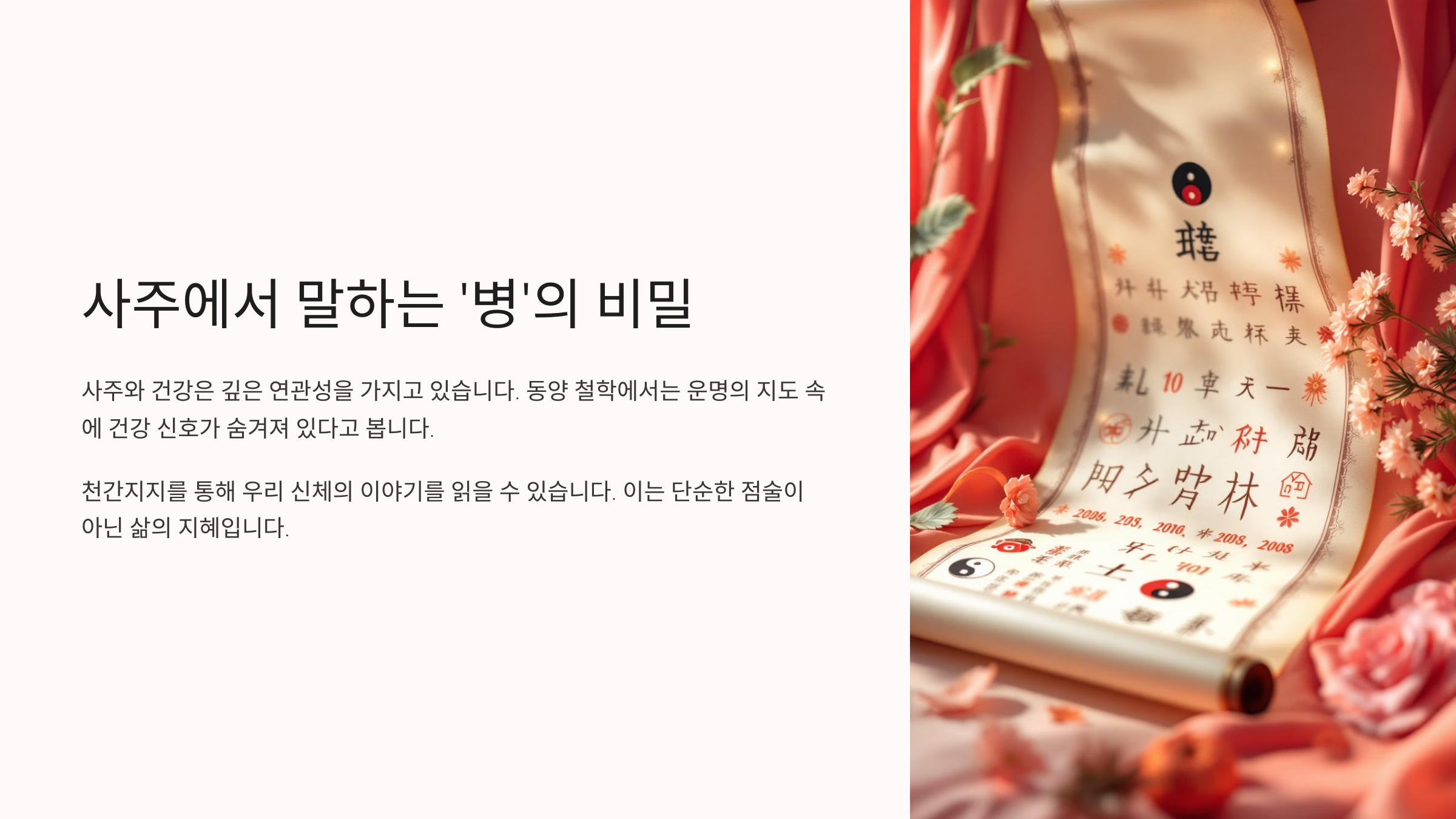 "사주에 병이 많다"라는 말을 들으면 왠지 몸이 약하거나 건강에 문제가 생길 것 같아 걱정되는 경우가 많아요. 실제로 많은 분들이 이런 해석에 불안을 느끼고, 심하면 병원을 찾거나 생활 패턴까지 바꾸려고 하기도 해요.
