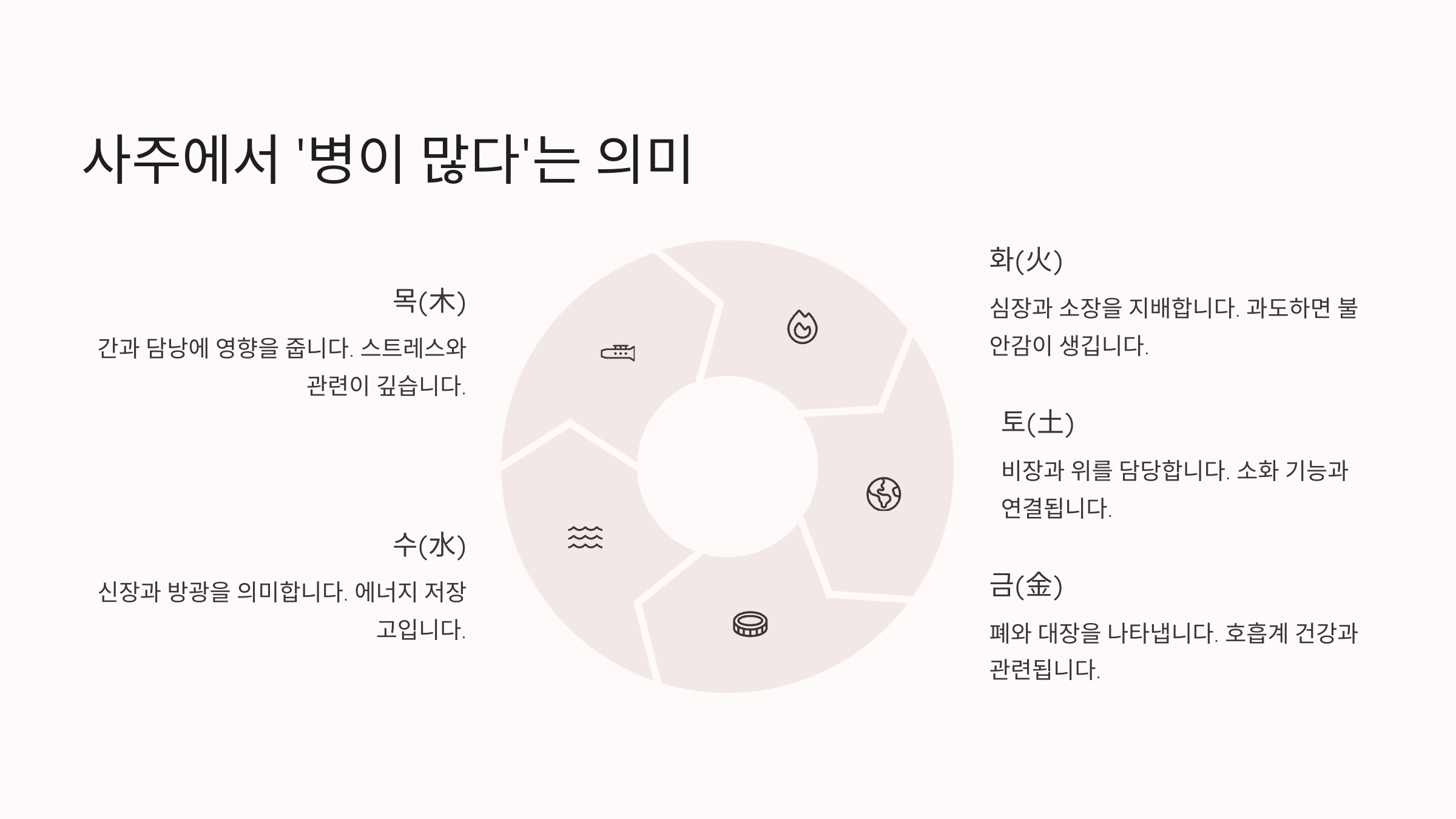 사주에서 말하는 ‘병’이라는 단어는 일상에서 쓰는 병, 질병의 의미와는 조금 달라요. 사주명리학에서는 인체가 우주 자연의 기운으로 구성되어 있다고 보고, 그 기운의 조화와 흐름에 따라 사람의 운이나 성향, 건강까지 판단하거든요. 여기서 ‘병’은 오행의 과하거나 부족한 흐름을 뜻해요.예를 들어, 목(木)의 기운이 너무 강하거나 부족할 때 ‘간(肝)’과 관련된 장기 문제가 있다고 해석할 수 있지만, 이건 반드시 질병이 있다는 뜻은 아니에요. 기운의 흐름이 어긋났다는 뜻일 뿐, 실제 증상이 있을지 없을지는 개인의 생활 습관이나 마음가짐에 따라 달라질 수 있어요.