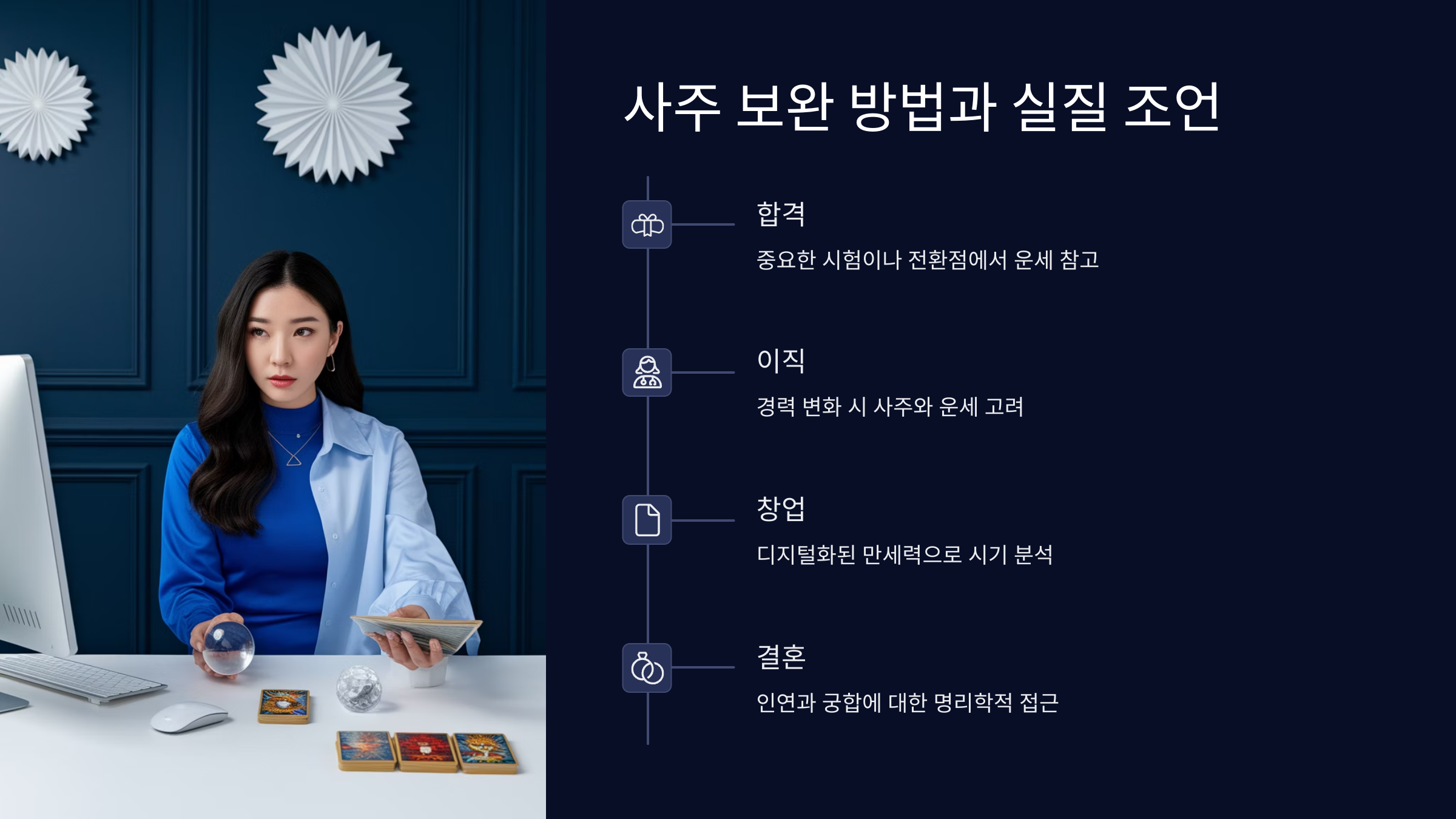 내가 생각했을 때, 사주라는 건 나의 약점과 강점을 알려주는 거울 같다고 느껴요. 거울을 통해 나를 더 잘 알고, 부족한 부분을 채울 수 있다면 그 자체로도 이미 사업에 한 걸음 다가간 거예요. 사주에만 얽매이지 않고 본인의 성향과 준비 정도를 함께 고려해야 해요.