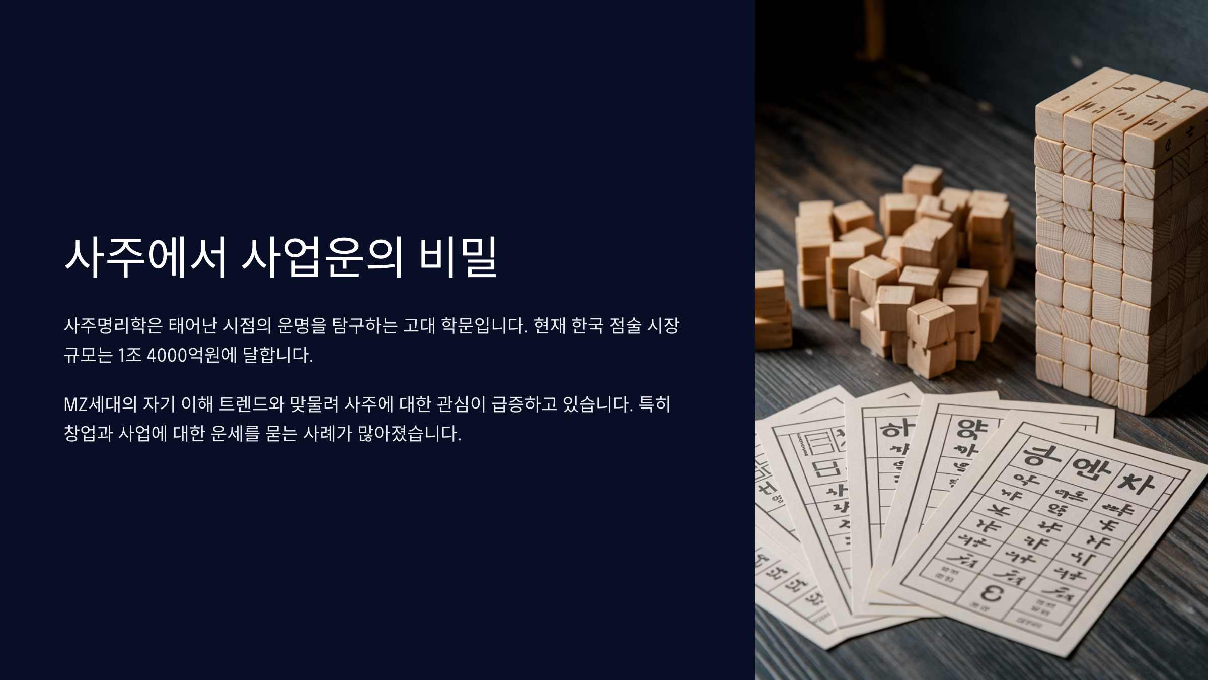 사주는 오랜 시간 동양 철학의 한 축을 담당해온 인생의 로드맵 같은 존재예요. 그중에서도 사업운은 요즘처럼 창업이 활발한 시대에 사람들에게 많은 관심을 받고 있죠. 그런데 사주에 '사업운이 없다'는 말을 들으면 왠지 모르게 주춤하게 돼요. 혹시 창업을 하면 안 되는 건지, 정말 실패할 수밖에 없는지 궁금해지기도 하죠.