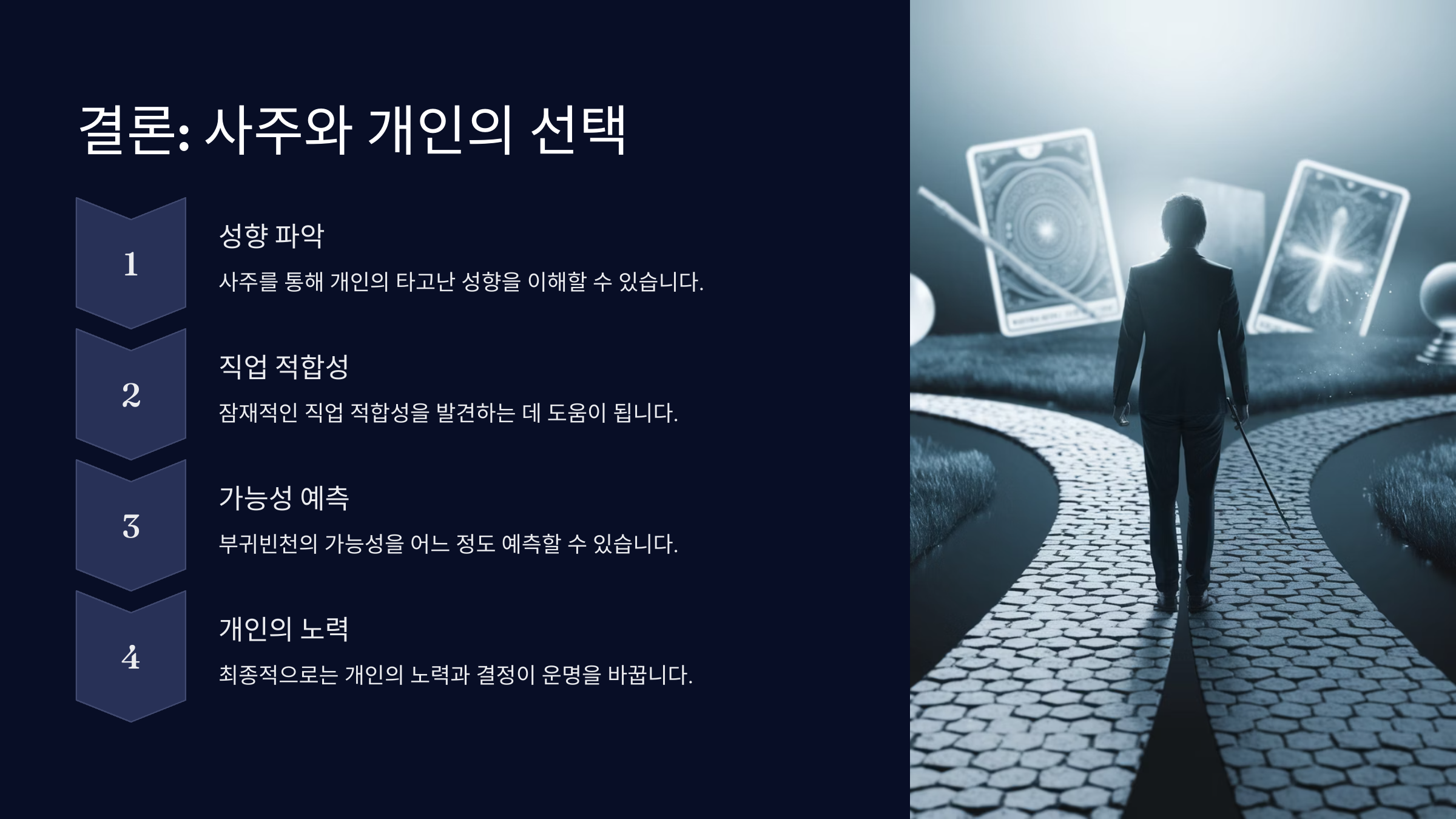 네 번째는 심리적인 안정이에요. 사주에 너무 얽매이면 오히려 자기 확신이 흔들릴 수 있어요. 명리학도 결국 통계와 해석의 영역이기 때문에, 긍정적인 마음가짐과 열정이 가장 큰 에너지가 돼요. 사주는 방향을 알려줄 뿐, 주인공은 바로 '나'라는 걸 잊지 마세요. 😊