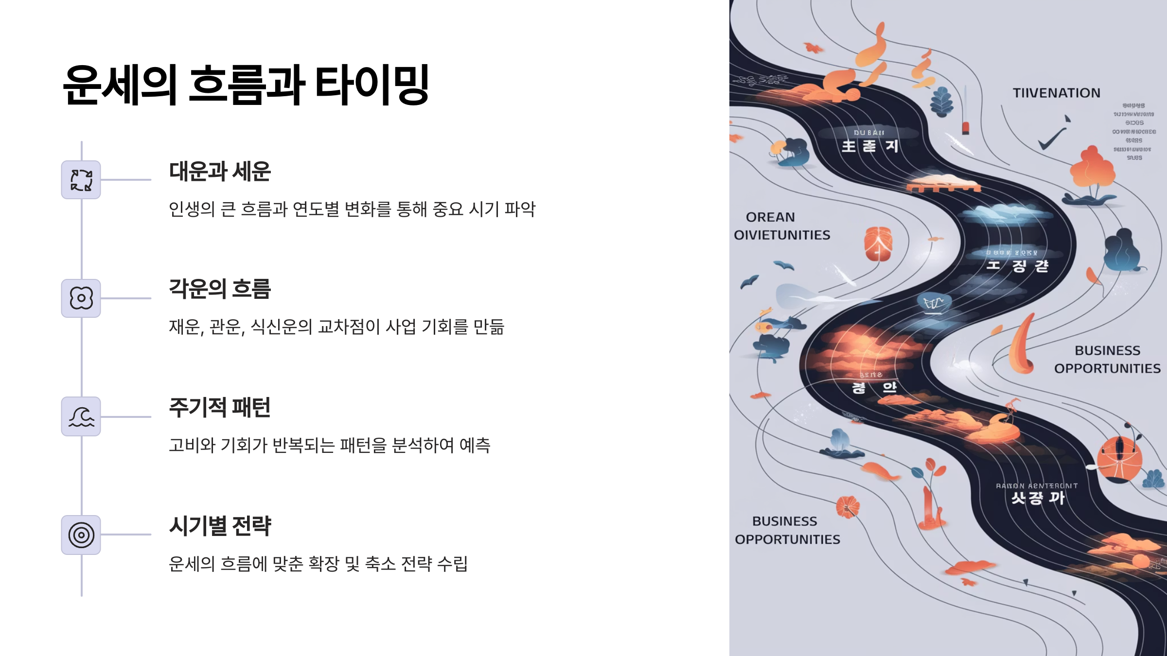 사주에서 아무리 사업운이 강하다고 해도, 운의 흐름이 받쳐주지 않으면 제대로 힘을 발휘하기 어려워요. 이때 중요한 게 바로 '대운'과 '세운'이라는 흐름이에요. 대운은 인생 10년 단위의 큰 사이클이고, 세운은 매년의 변화죠.