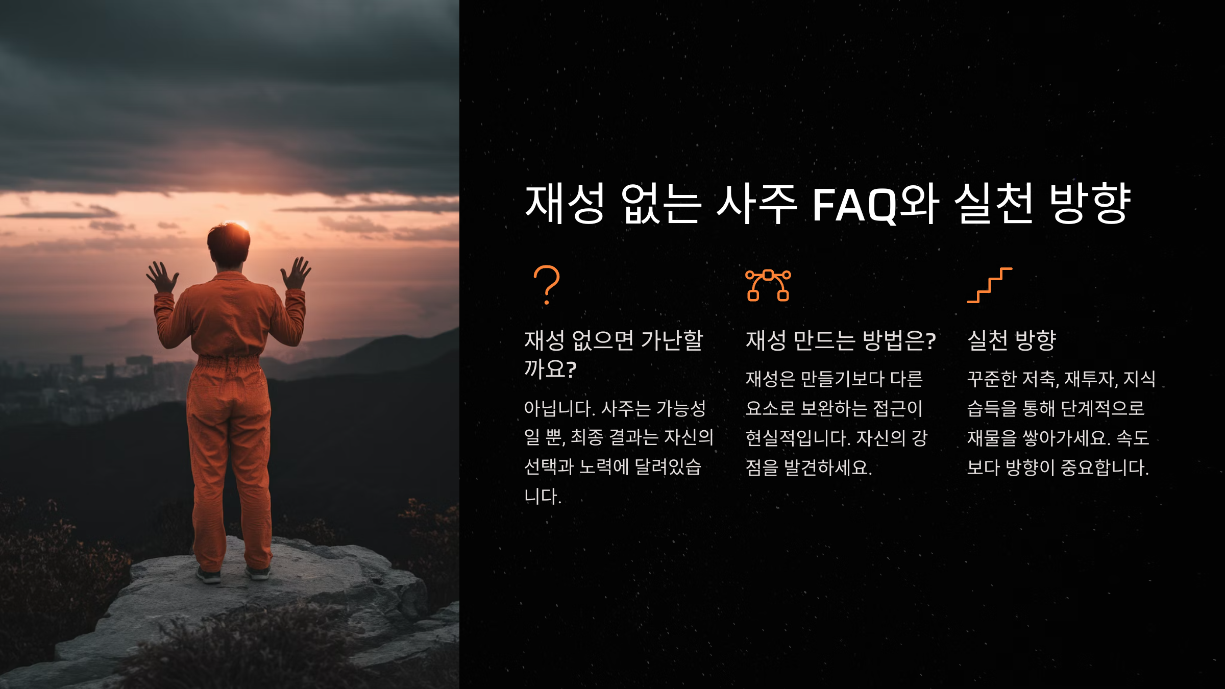 이처럼 사주는 ‘전체적인 조화와 흐름’을 보는 것이 중요하고, 단편적인 재성만으로 부를 판단하면 큰 착오가 생길 수 있어요. 오히려 무재성 사주가 일정 시기 운과 조화를 이룰 때 엄청난 부를 창출할 수 있는 경우도 자주 있어요.