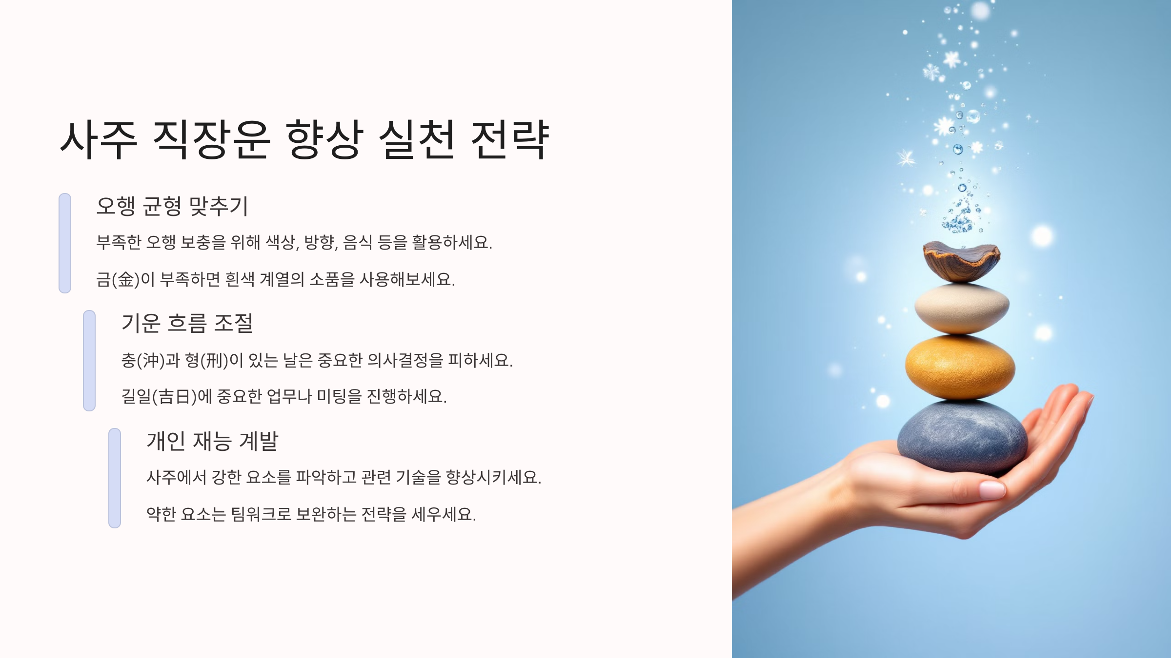 내가 생각했을 때, 사주는 단순히 운세를 말하는 게 아니라 방향성과 시기를 알려주는 나침반 같아요. 직장운이 없다는 말도 단순히 '회사 생활이 힘들다'는 의미보다는, 조직보단 개인의 자율성이 강한 환경이 더 잘 맞는다는 걸 뜻하는 경우가 많아요. 그렇다면 어떻게 이 신호를 읽고 실천으로 옮길 수 있을까요?