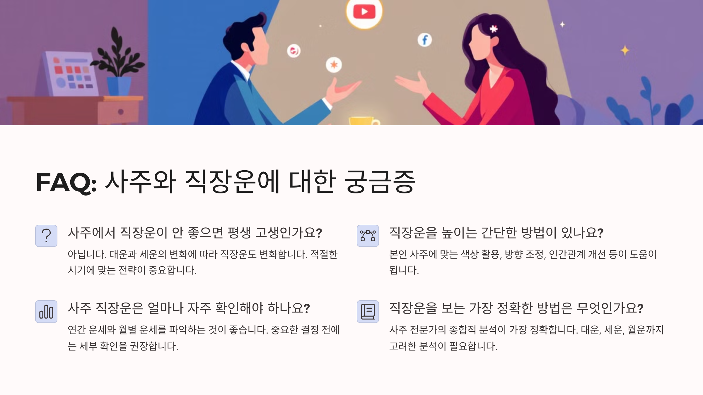 직장운이 약하거나 없다고 나오는 사주, 그 해석을 보고 마음이 불안해지는 분들 정말 많아요. 특히 퇴사를 고민하고 있는 시점이라면 더더욱 그 결과에 예민해질 수밖에 없죠. 과연 정말 직장운이 없다면 회사를 그만둬야 할까요? 사주에서 말하는 '직장운 없음'의 진짜 의미와 그에 따른 현실적인 대응법을 지금부터 함께 살펴볼게요.