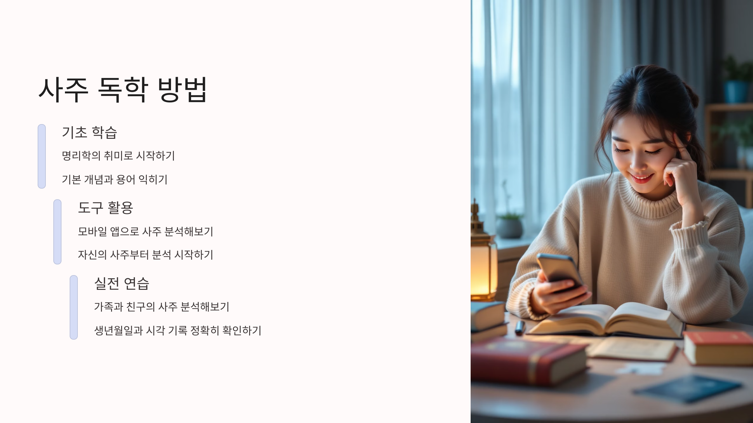 혼자서 사주를 공부하려면 체계적인 흐름과 학습 루틴을 잡는 게 정말 중요해요. 막연하게 유튜브나 블로그만 보는 방식은 쉽게 포기하게 되거든요. 먼저 목표를 ‘이해 중심’으로 잡는 게 좋아요. ‘사주팔자의 원리를 이해하고, 내 사주를 해석할 수 있는 수준’을 1차 목표로 세워볼 수 있어요.가장 먼저 해야 할 일은 출생 정보를 바탕으로 사주팔자를 작성하는 연습이에요. 요즘엔 앱이나 웹사이트에서도 쉽게 입력만 하면 사주팔자를 출력해주지만, 처음에는 직접 천간지지를 손으로 써보는 습관을 들이는 걸 추천해요 ✍