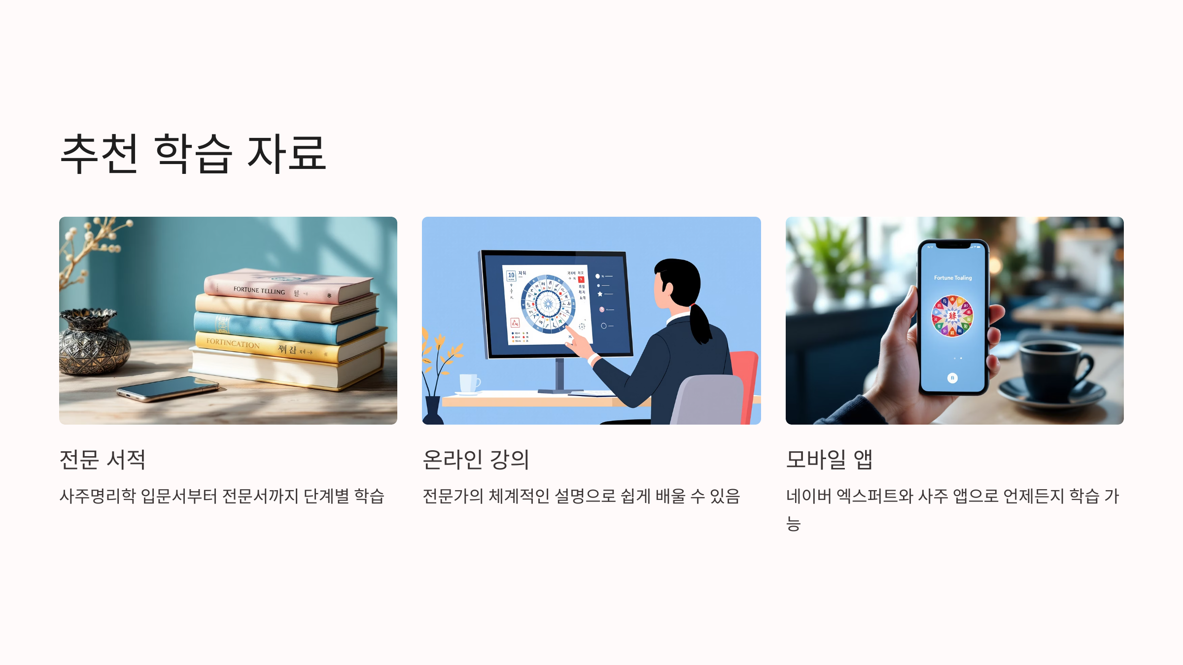 그리고 요즘은 온라인 강의도 많이 나와 있어요. 유튜브에서는 ‘홍정환 명리학’, ‘사주명리의 정석’, ‘정해인의 사주 스쿨’ 등이 독학자들 사이에서 입문과 이론 정리에 효과적이라고 평가받고 있어요 🎧