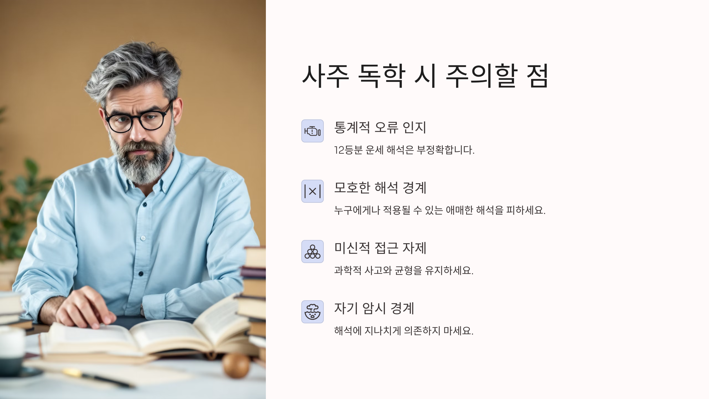 두 번째는 ‘해석을 단정적으로 하는 것’이에요. “이 사주는 무조건 돈이 없을 운명”처럼 단정 지으면 큰 오해를 낳을 수 있어요. 사주는 확률과 흐름을 읽는 도구이지, 정답을 알려주는 시험지가 아니거든요.