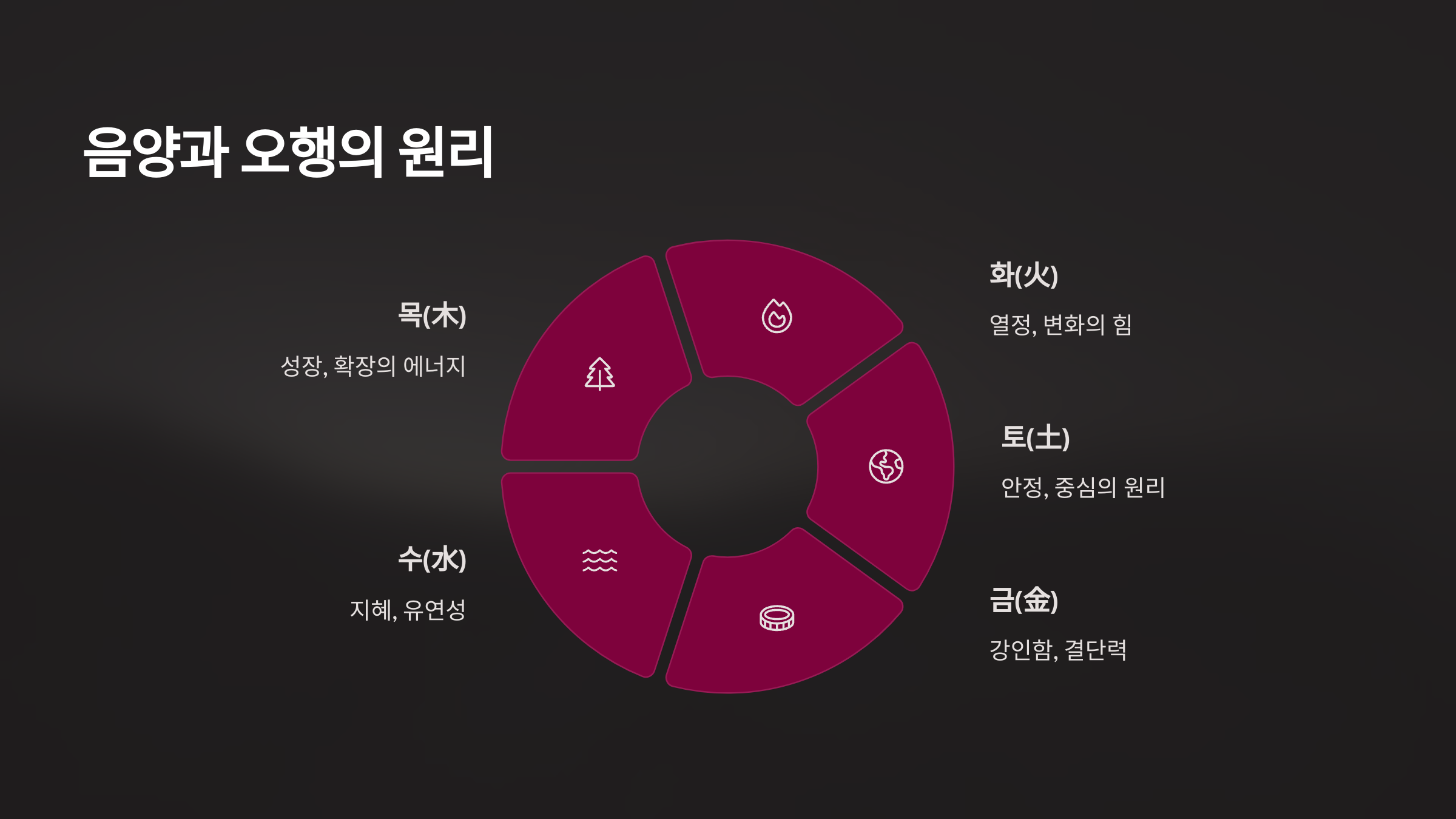 사주를 이해하려면 반드시 오행(五行)과 음양(陰陽)의 원리를 알아야 해요. 이 두 가지는 사주의 '기본 언어'와 같아요. 음양은 모든 사물의 이치가 두 가지 상반된 기운으로 구성된다는 철학이고, 오행은 자연의 다섯 가지 원소로 세상의 모든 에너지를 분류한 체계예요.오행은 ‘목(木)’, ‘화(火)’, ‘토(土)’, ‘금(金)’, ‘수(水)’로 구성돼요. 각각의 오행은 특정한 성격, 성향, 직업군, 질병 경향, 계절 등 다양한 삶의 요소와 연결돼 있어요. 예를 들어, 목은 봄과 관련 있고 성장, 확장성의 기운을 상징해요. 수는 겨울과 연결돼 깊이, 지혜, 감성 등을 뜻하죠.