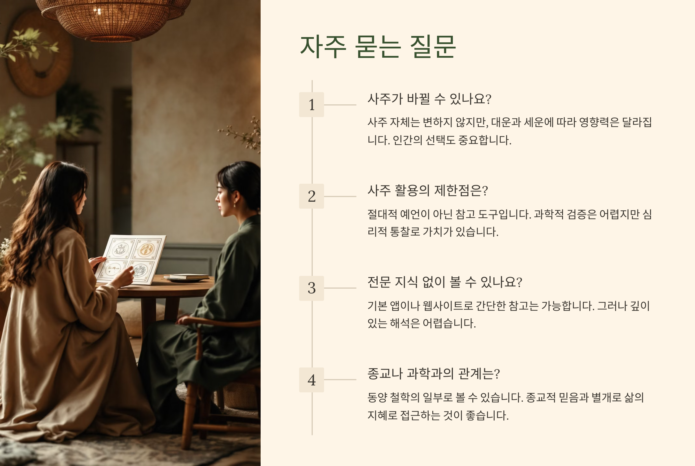 항목 설명 주의할 점 일간 해석의 중심 먼저 파악해야 함 용신 균형을 위한 키워드 찾는 방법 숙지 필요 오행 기운의 흐름 불균형은 나쁘지 않음 인터넷 풀이 참고용으로 활용 전적으로 의존 금지 사주는 결국 자신을 돌아보는 도구예요. 나를 이해하고 주변과의 조화를 알아가는 과정이죠. 완벽하게 해석하려 하기보다는, 즐기면서 배우는 마음이 가장 중요해요. 이제 마지막 섹션! 자주 묻는 질문들을 모아봤어요 🙋♂️