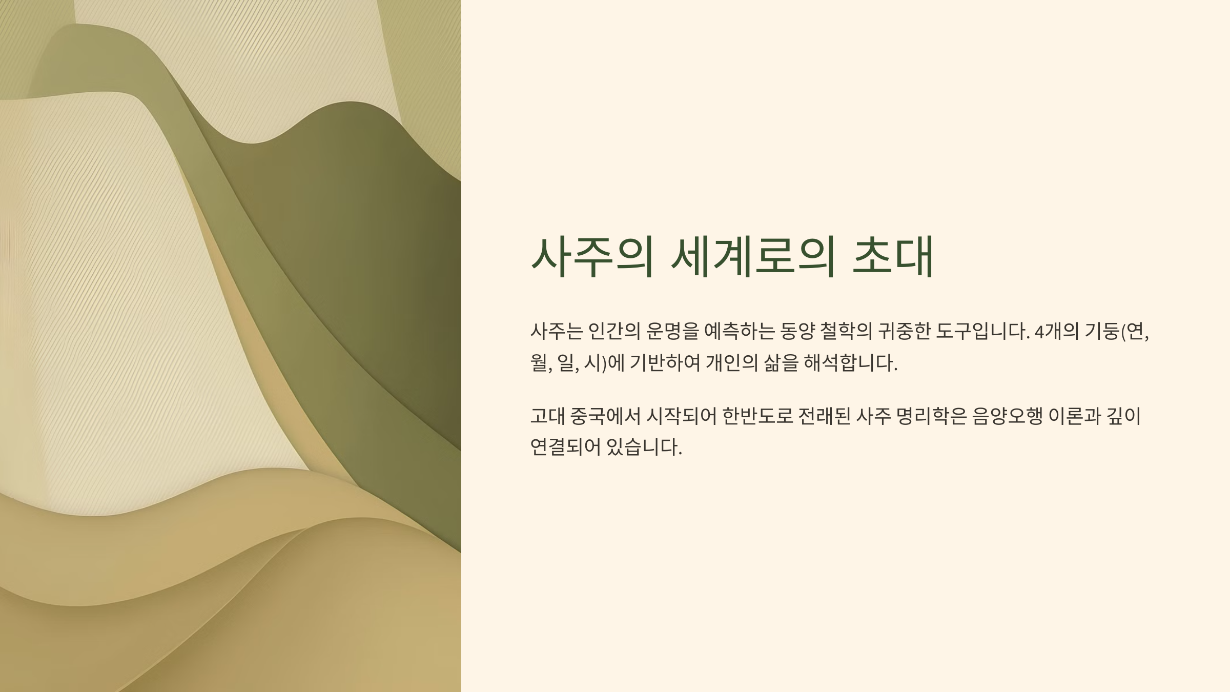 지금부터는 본격적으로 사주의 구조와 원리를 알아보는 순서를 하나씩 따라가 볼게요. 첫 번째 단계는 사주의 뿌리, 바로 그 의미와 역사부터 시작해요!