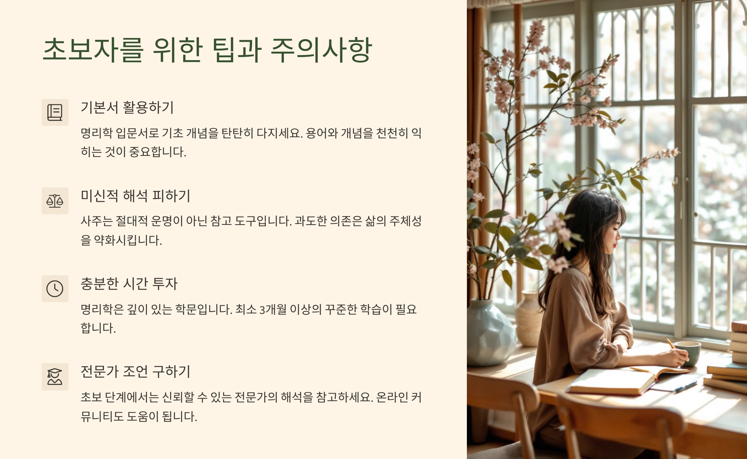 사주를 막 접한 초보자라면, 다양한 용어나 개념들에 당황할 수 있어요. 하지만 차근차근 핵심만 알고 가면 충분히 혼자서도 해석할 수 있답니다! 여기서는 처음 사주를 보는 분들이 꼭 알아야 할 실전 팁과 주의사항을 알려드릴게요 😊
