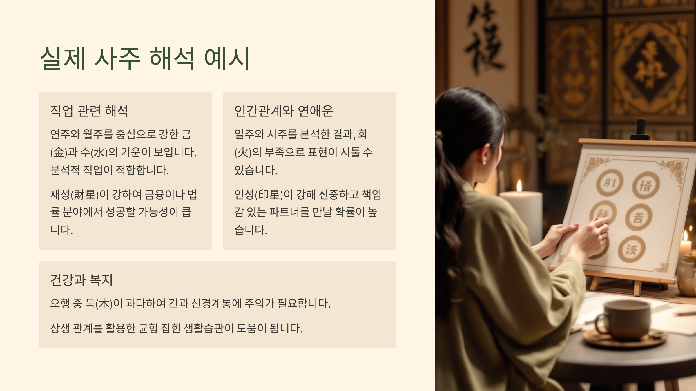 사주를 해석할 때 가장 중요한 건 ‘일간’을 중심으로 주변 요소들이 어떤 영향을 미치는지를 보는 거예요. 일간이 주인공이라면, 나머지 연주, 월주, 시주는 그 주변 인물과 환경이라 할 수 있어요. 마치 한 편의 드라마를 보는 것처럼 각 인물 간의 관계를 이해하는 게 포인트예요 🎭